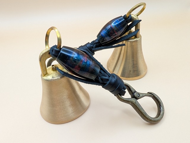 どちらかおひとつ当たりのお値段です 全長約19cm ベル直径5cm レザー紐(黒) レジン製蜻蛉玉 カラビナ(アンティークゴールド) ※光の当たり具合によって色の見え方は変化しますのでご了承ください。