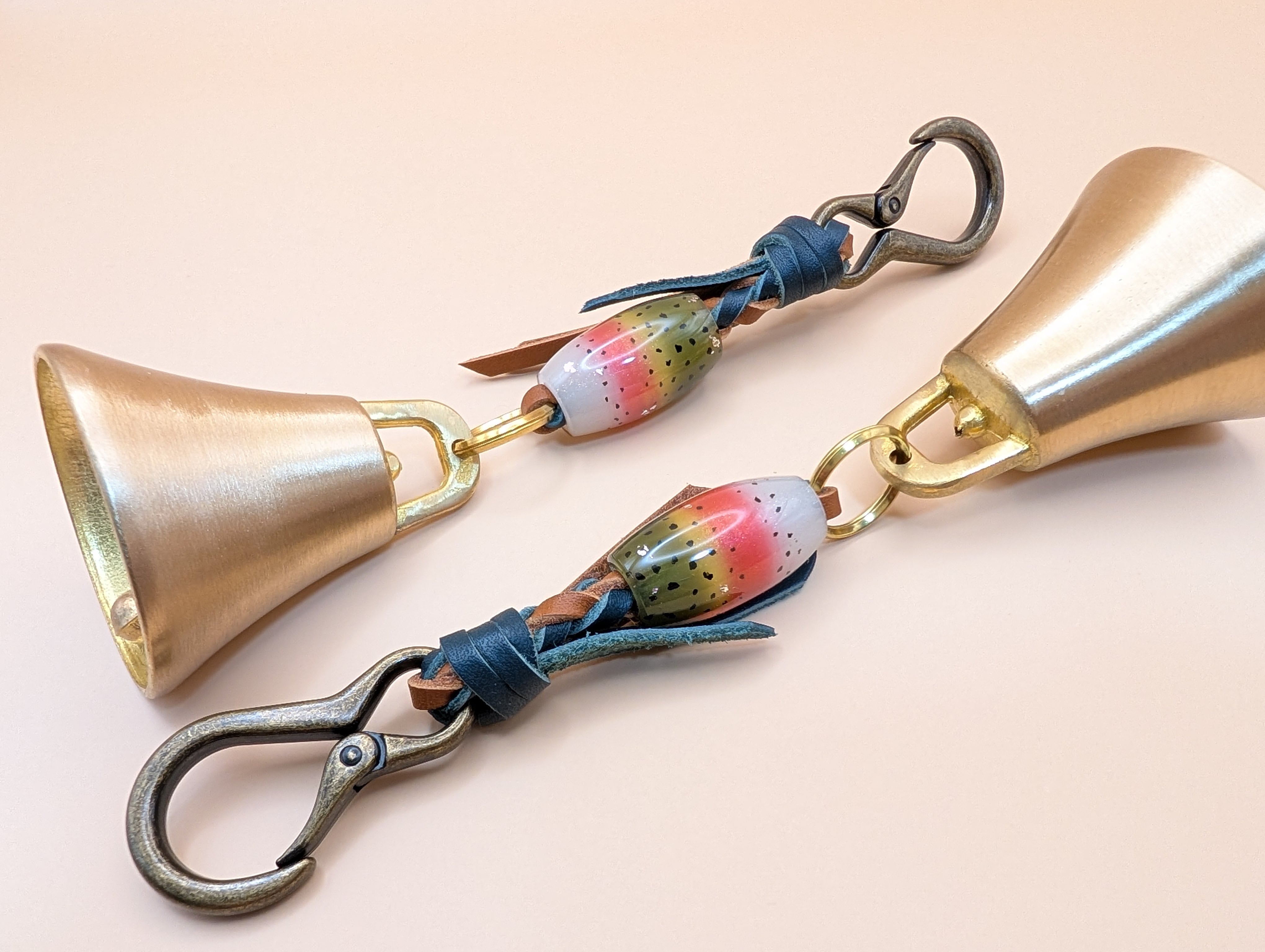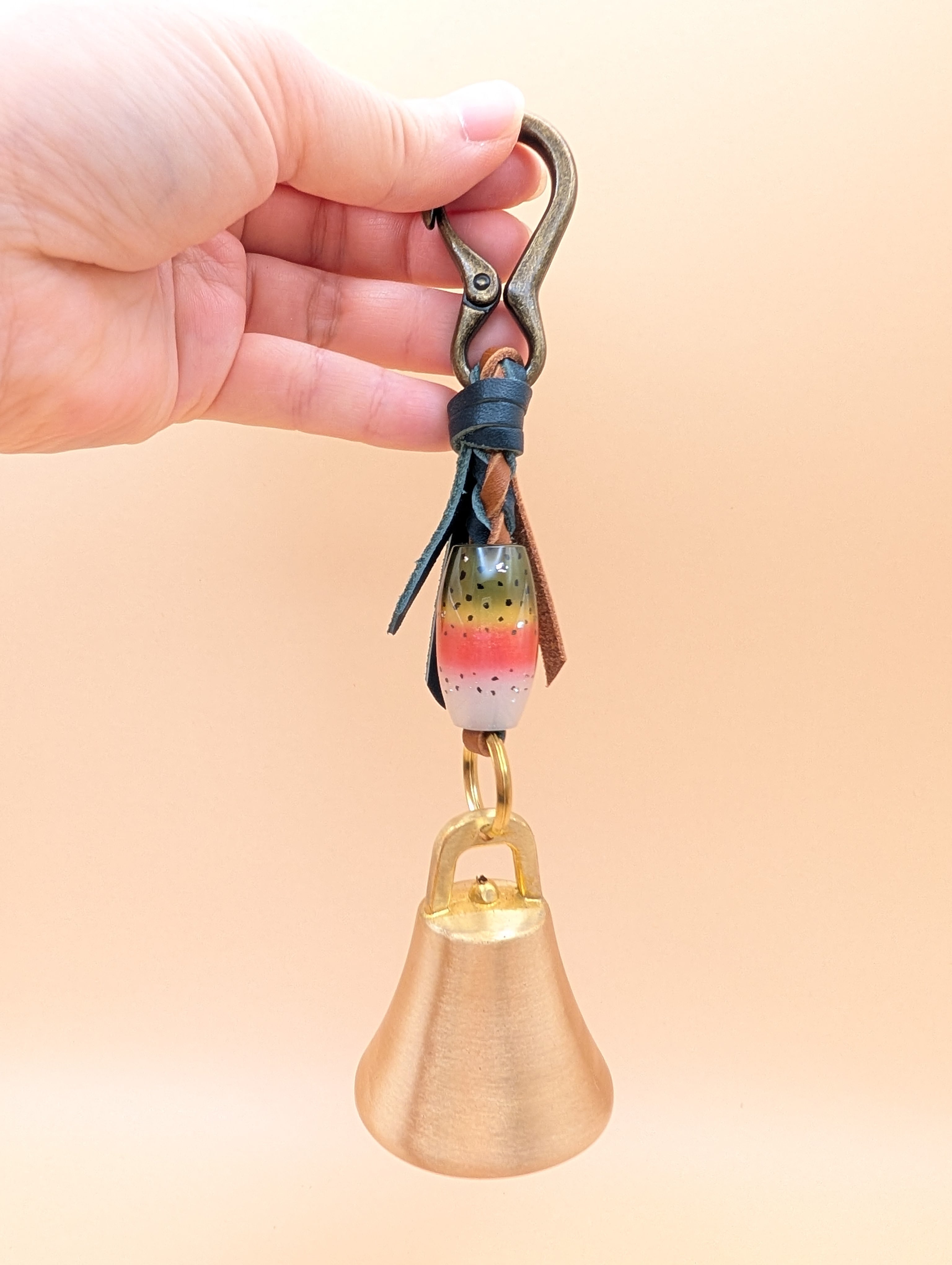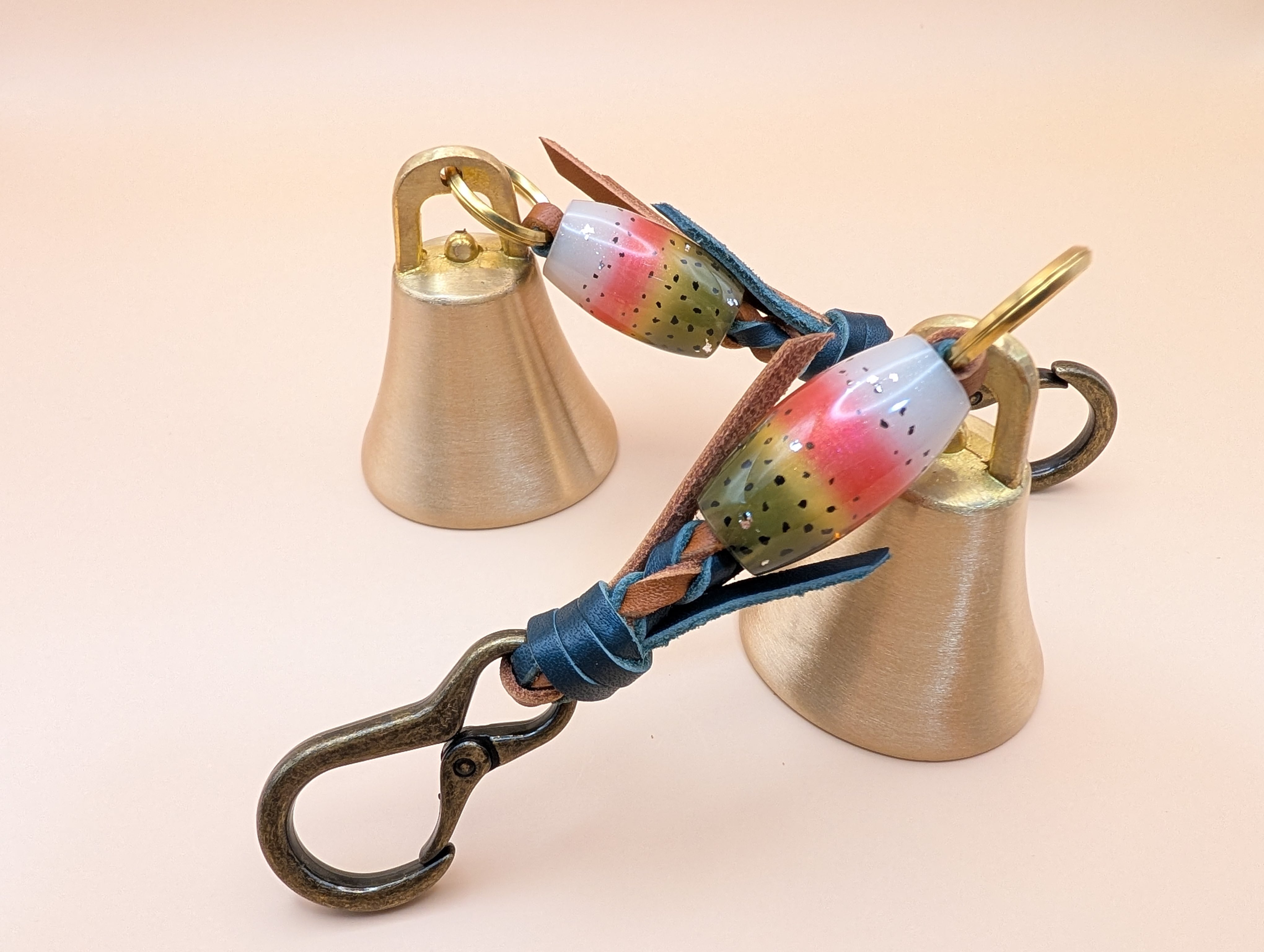 全長約19cm ベル直径5cm レザー紐(深緑×茶) レジン製蜻蛉玉 カラビナ(アンティークゴールド)