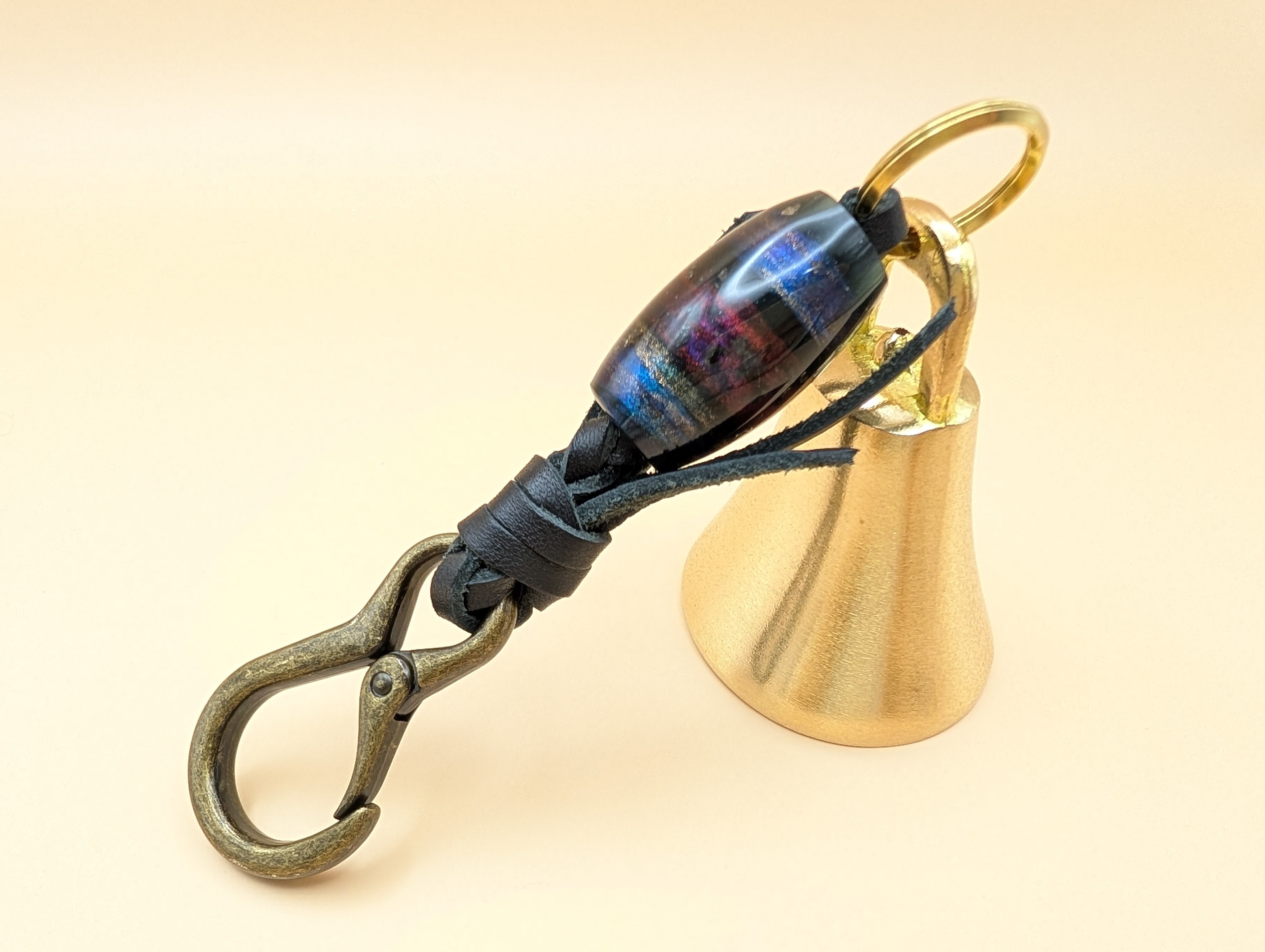 全長約19cm ベル直径5cm レザー紐(黒) レジン製蜻蛉玉 カラビナ(アンティークゴールド)