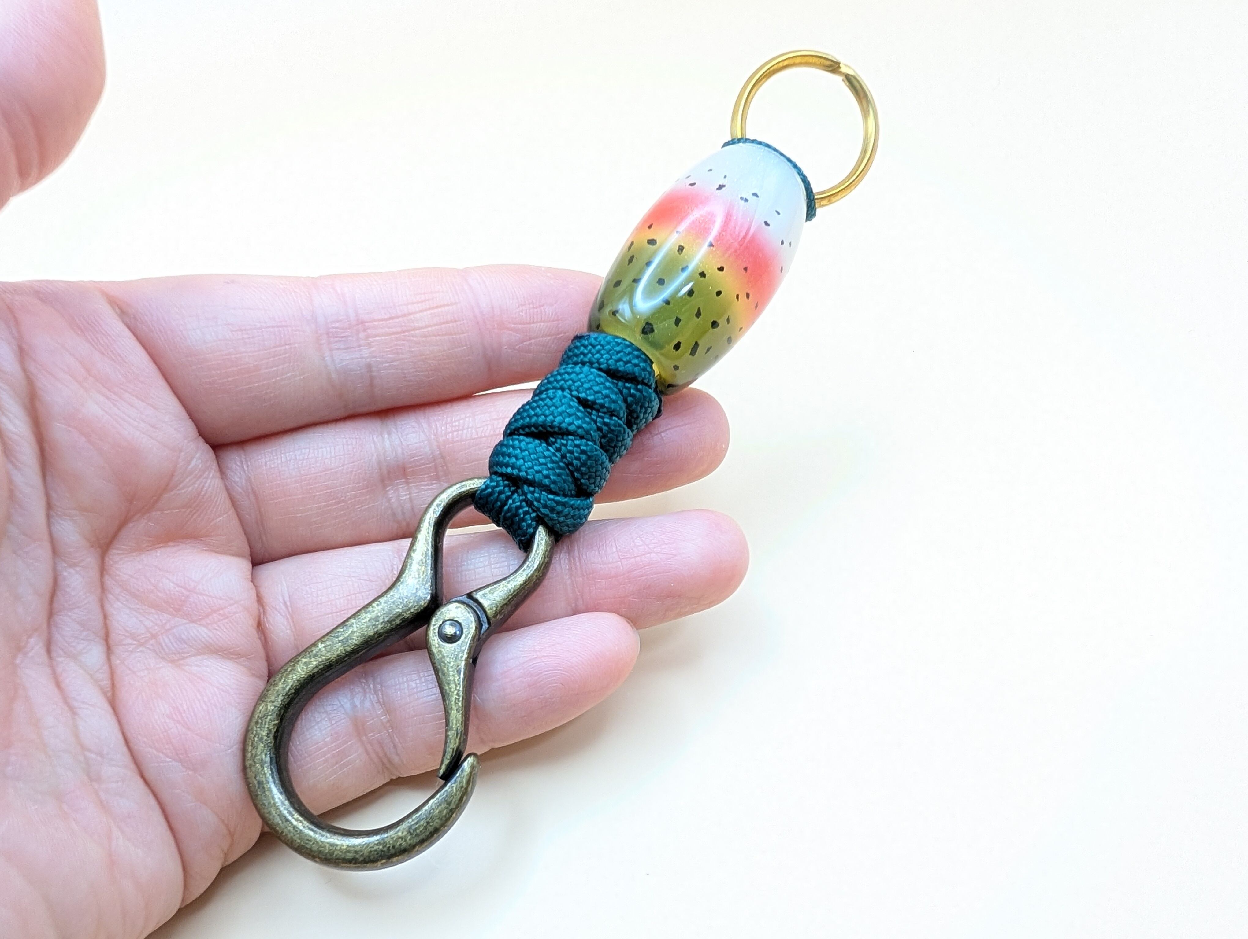 全長約12.5cm パラコード紐(深緑) レジン製蜻蛉玉 カラビナ(アンティークゴールド) 真鍮二重リング