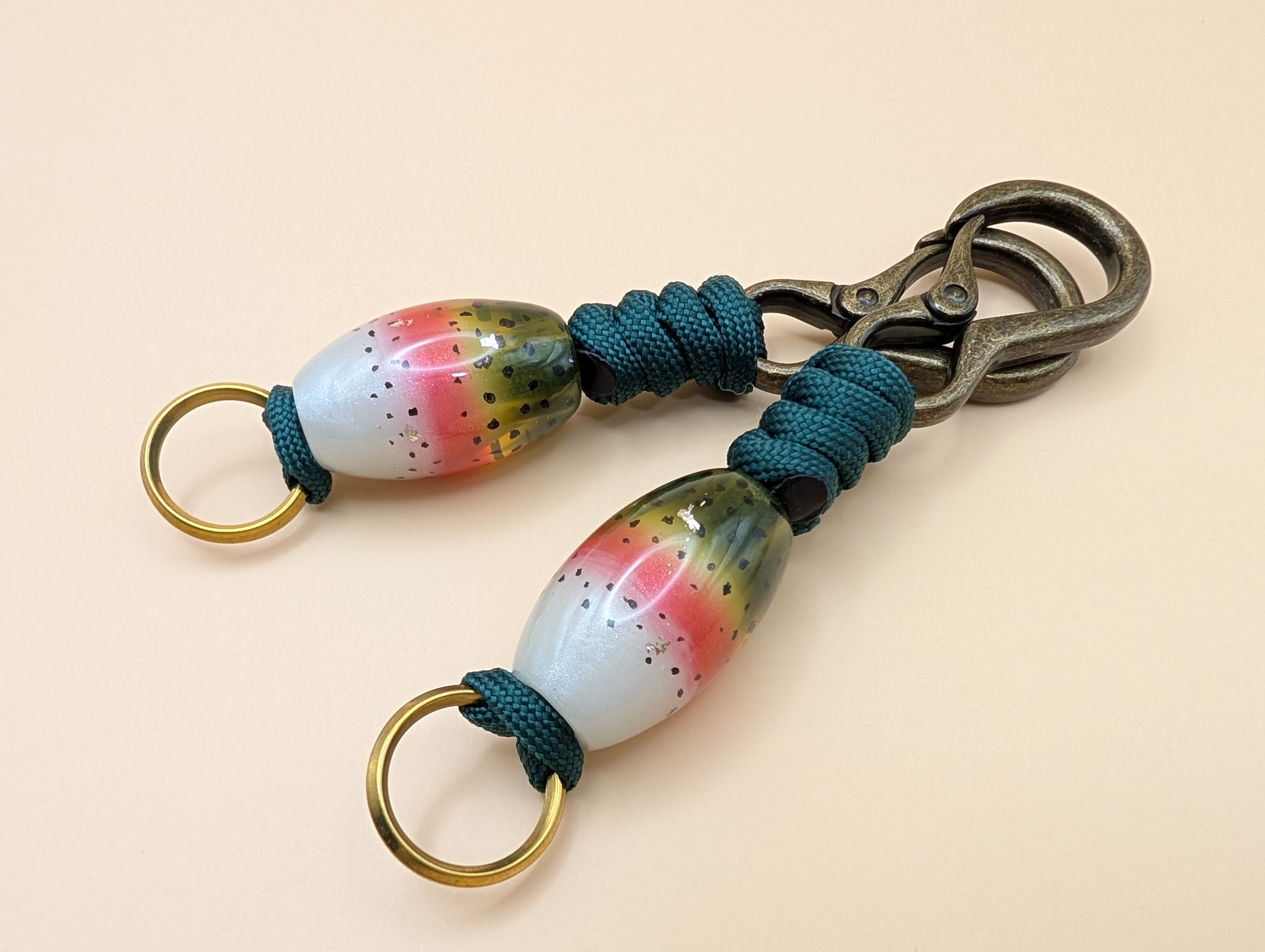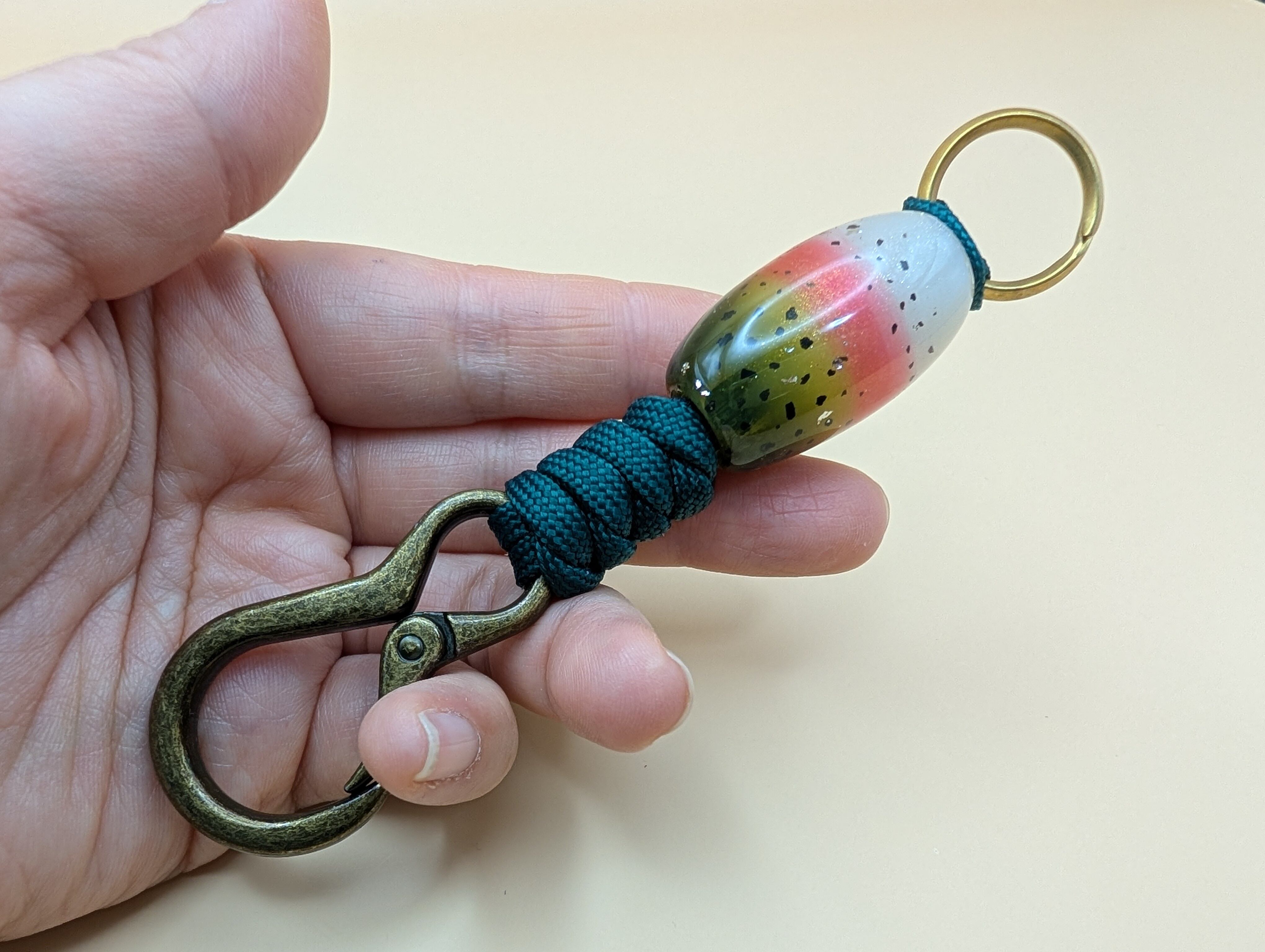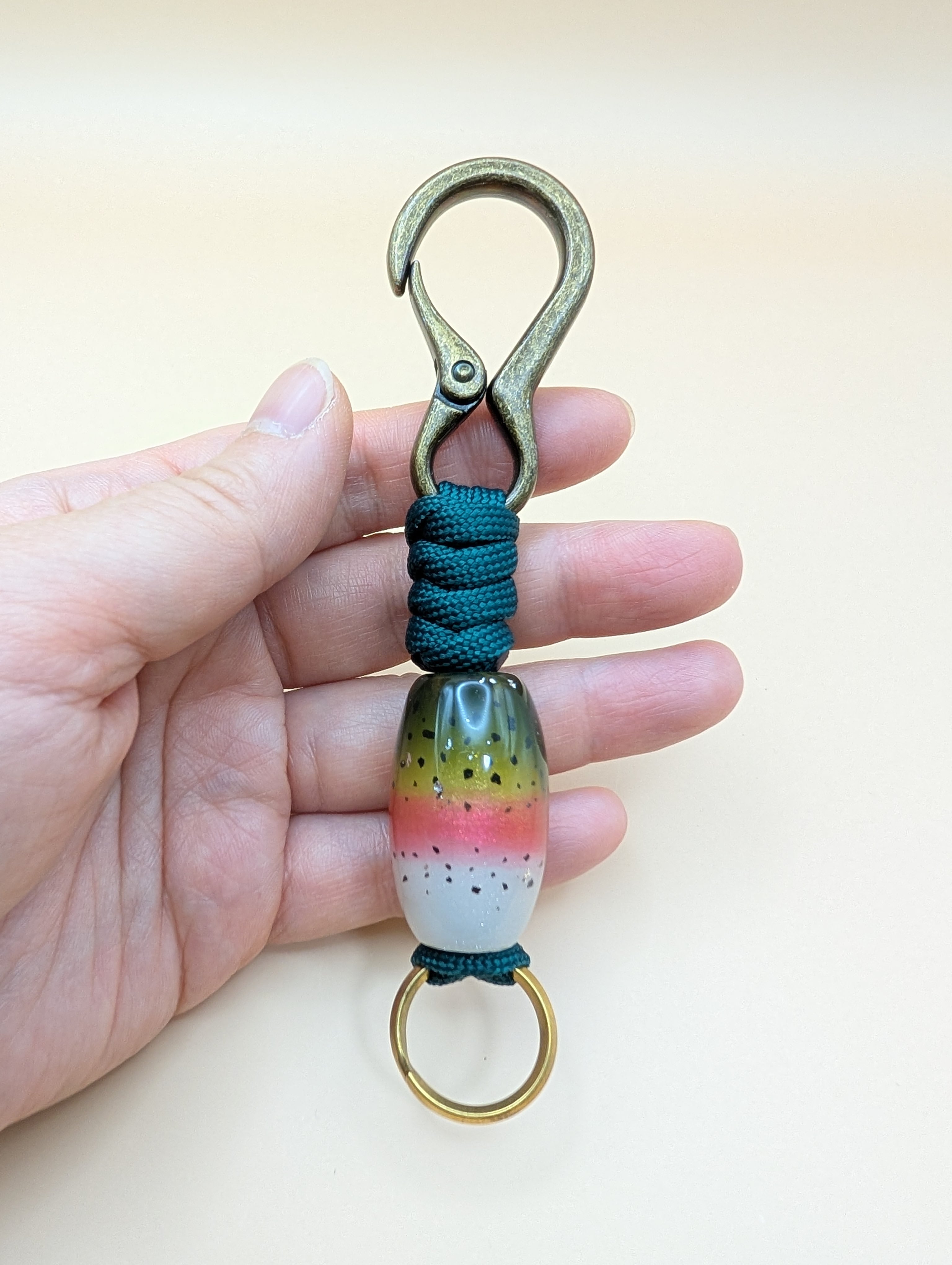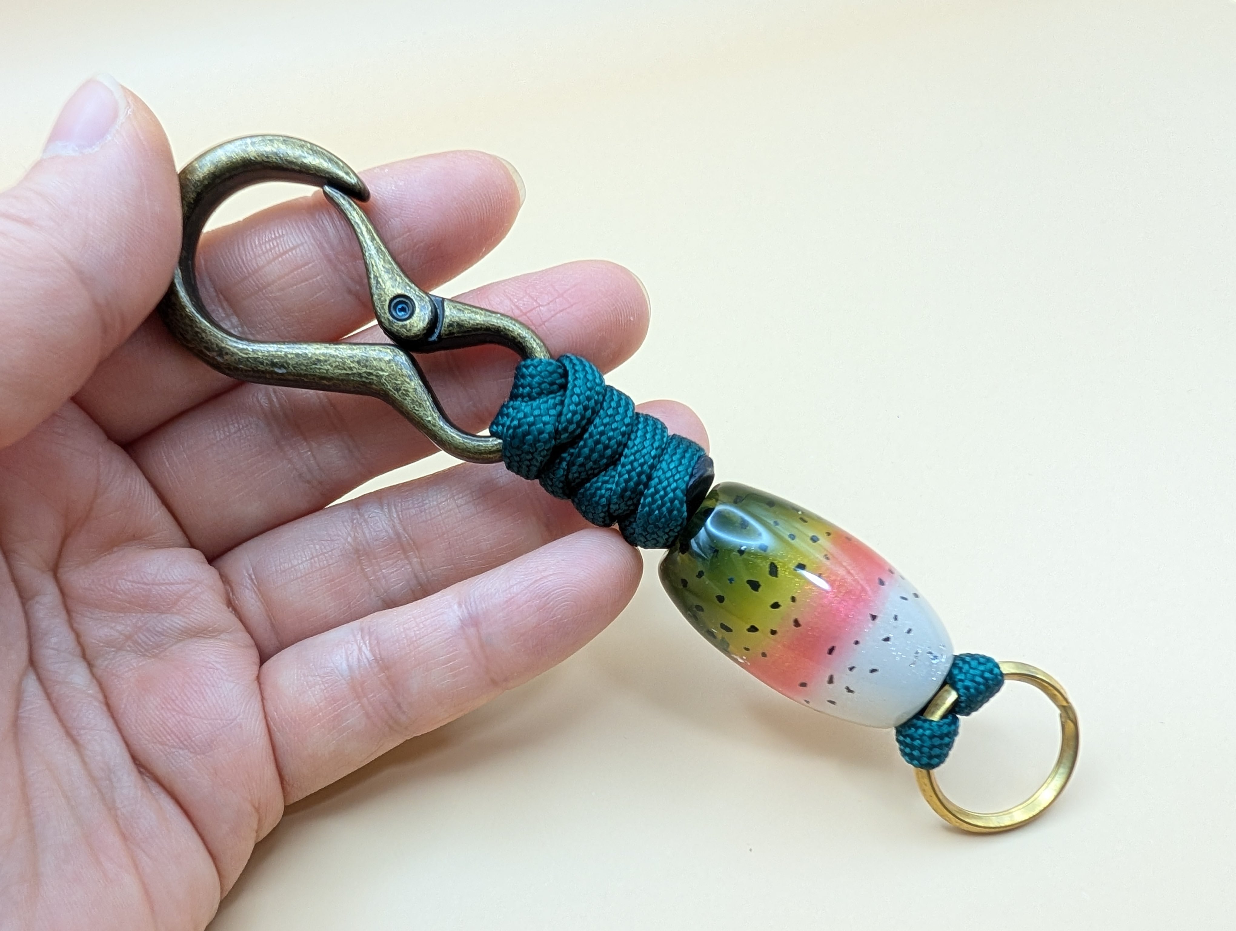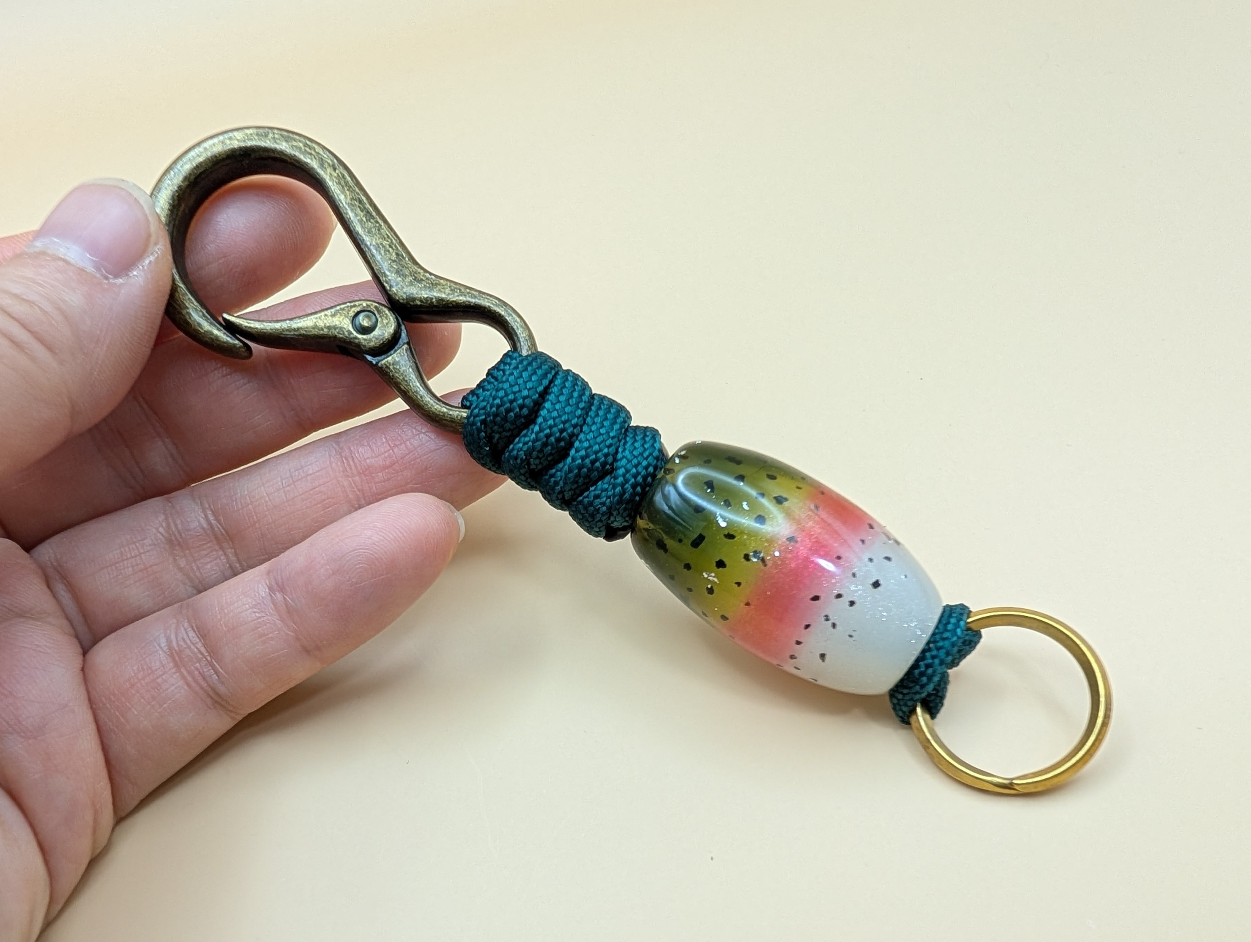 全長約12.5cm パラコード紐(深緑) レジン製蜻蛉玉 カラビナ(アンティークゴールド) 真鍮二重リング