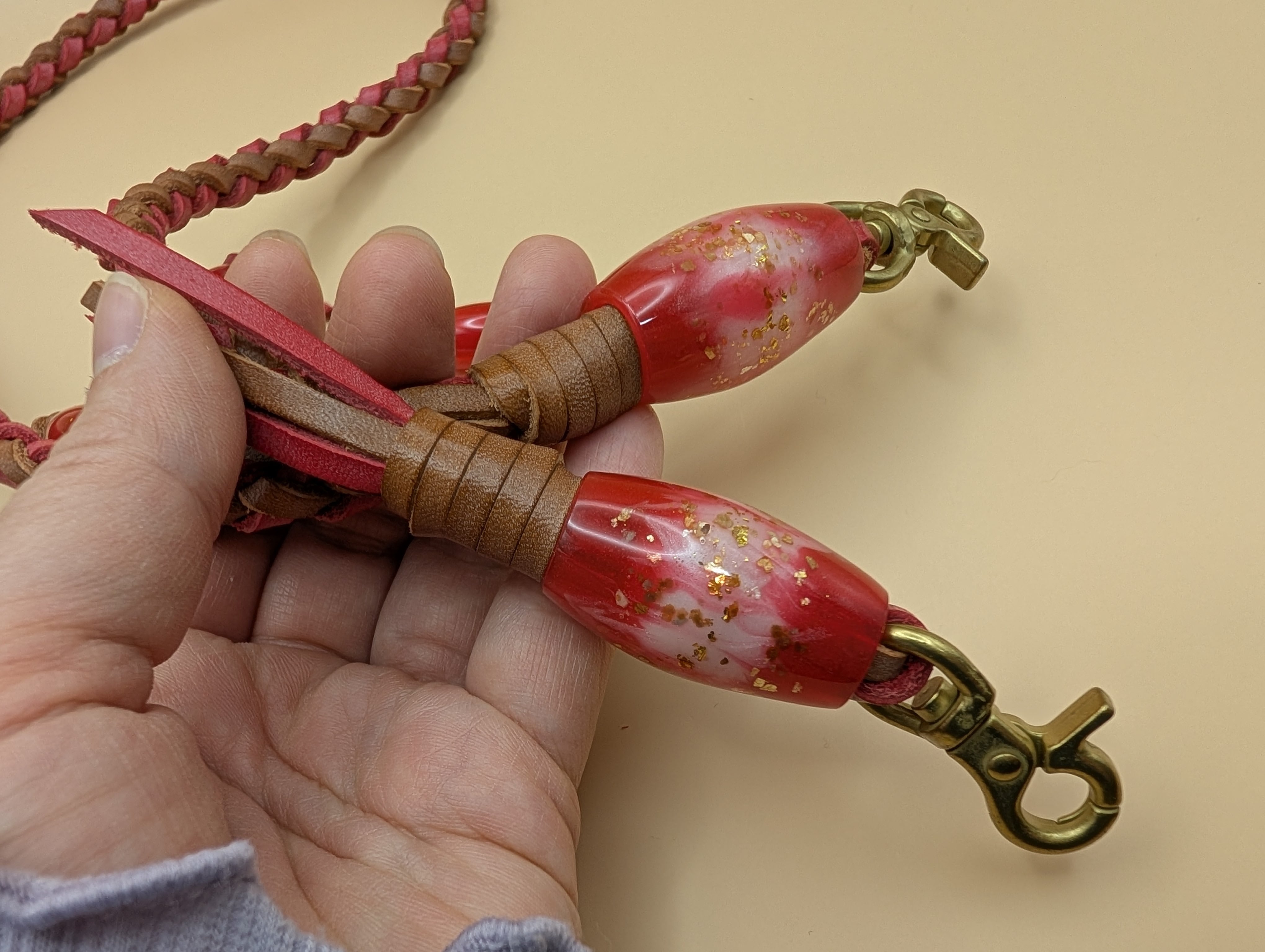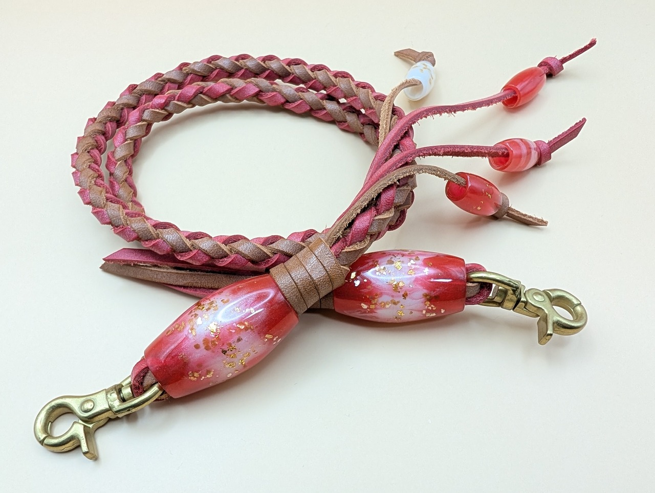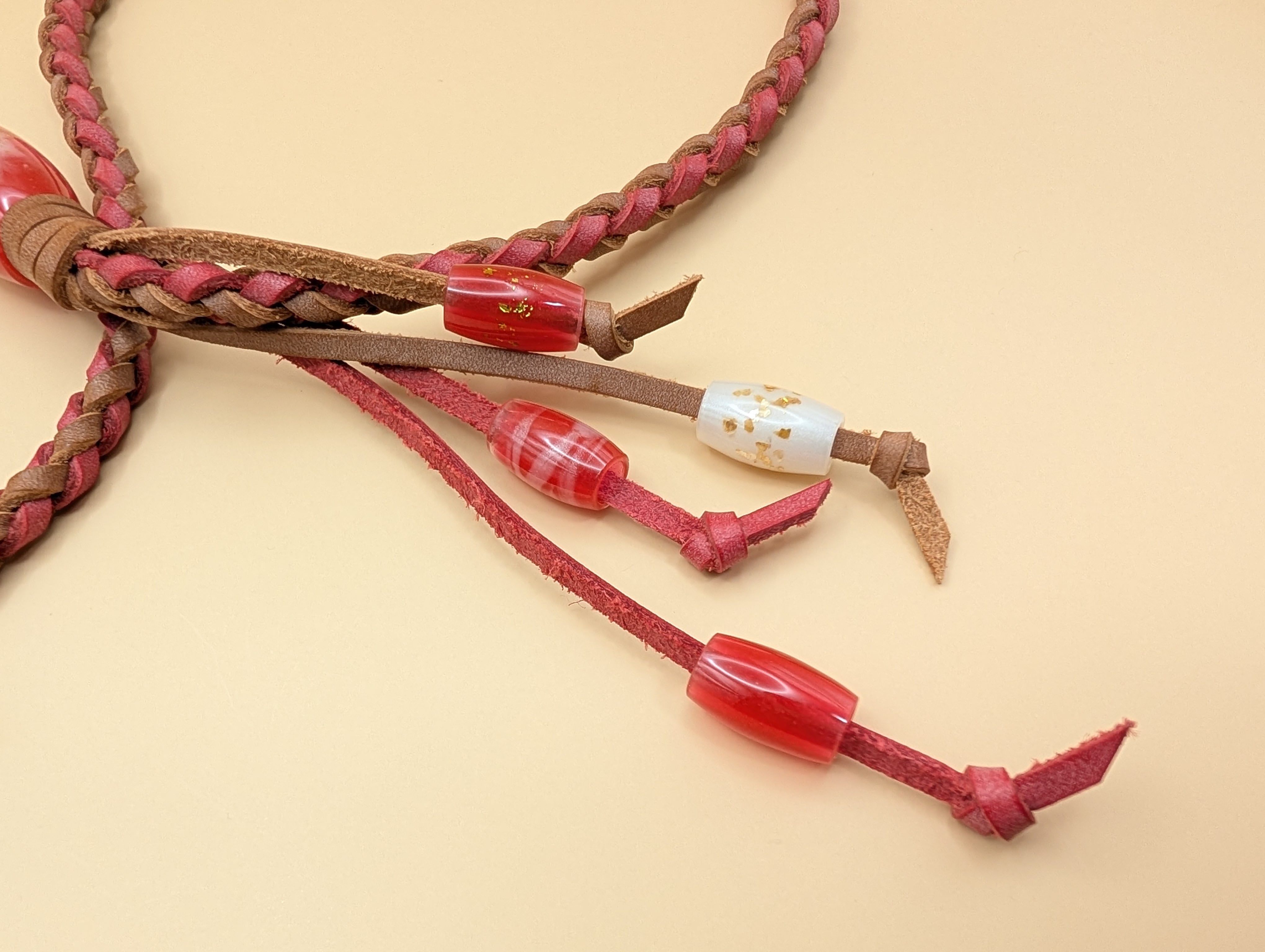 全長75cm レザー紐(赤×茶) レジン製蜻蛉玉 レバー付きナスカン金具(真鍮ゴールド色)