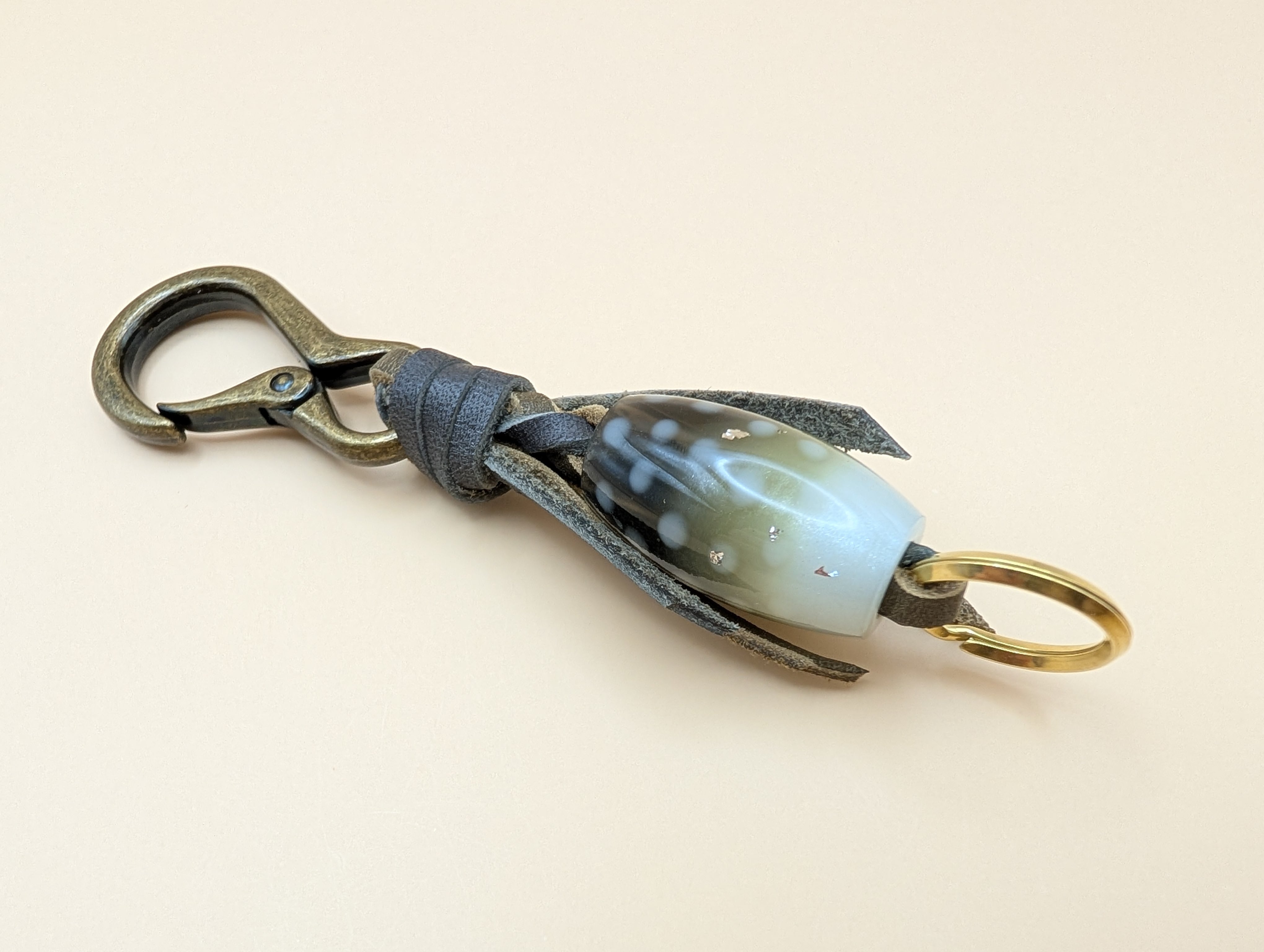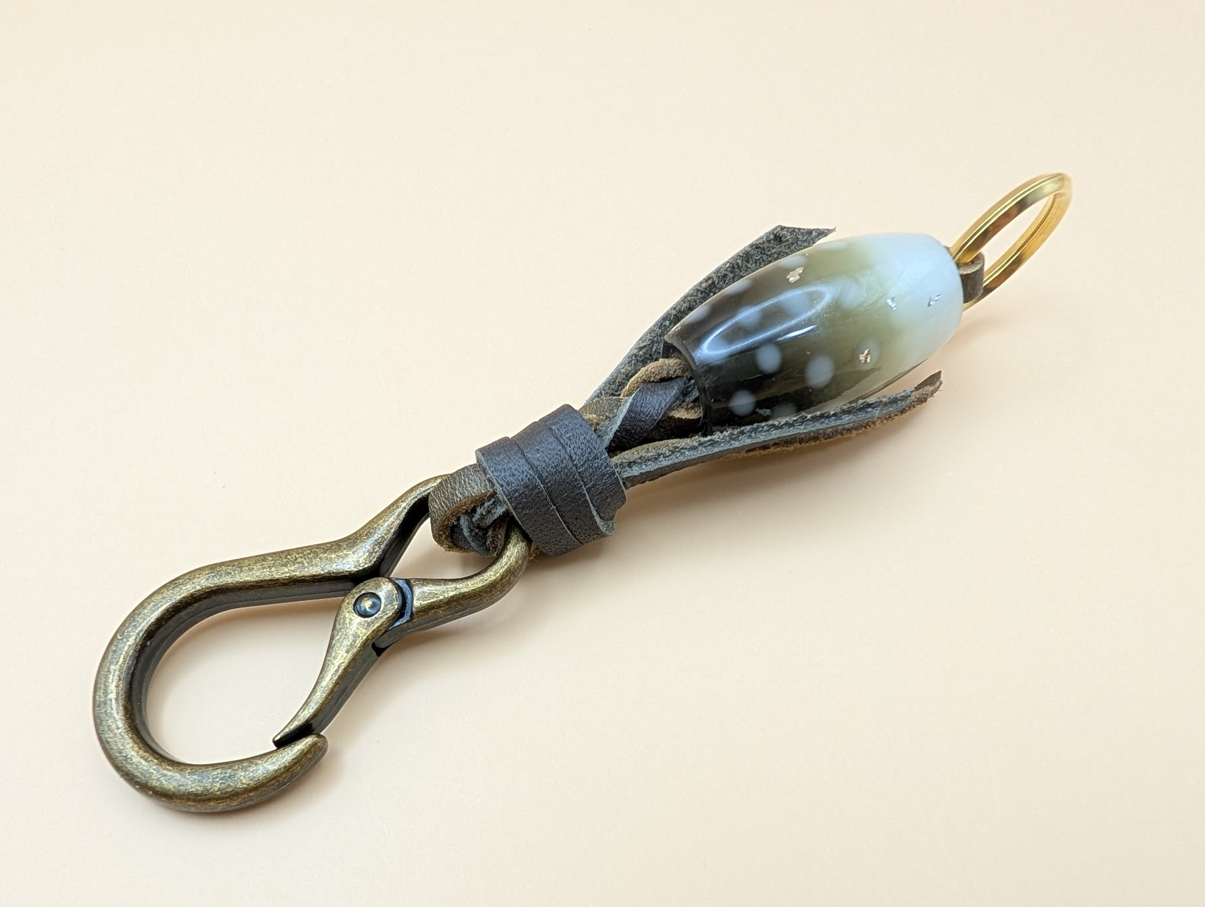 全長約12.5cm レザー紐(緑×茶) レジン製蜻蛉玉 カラビナ(アンティークゴールド)