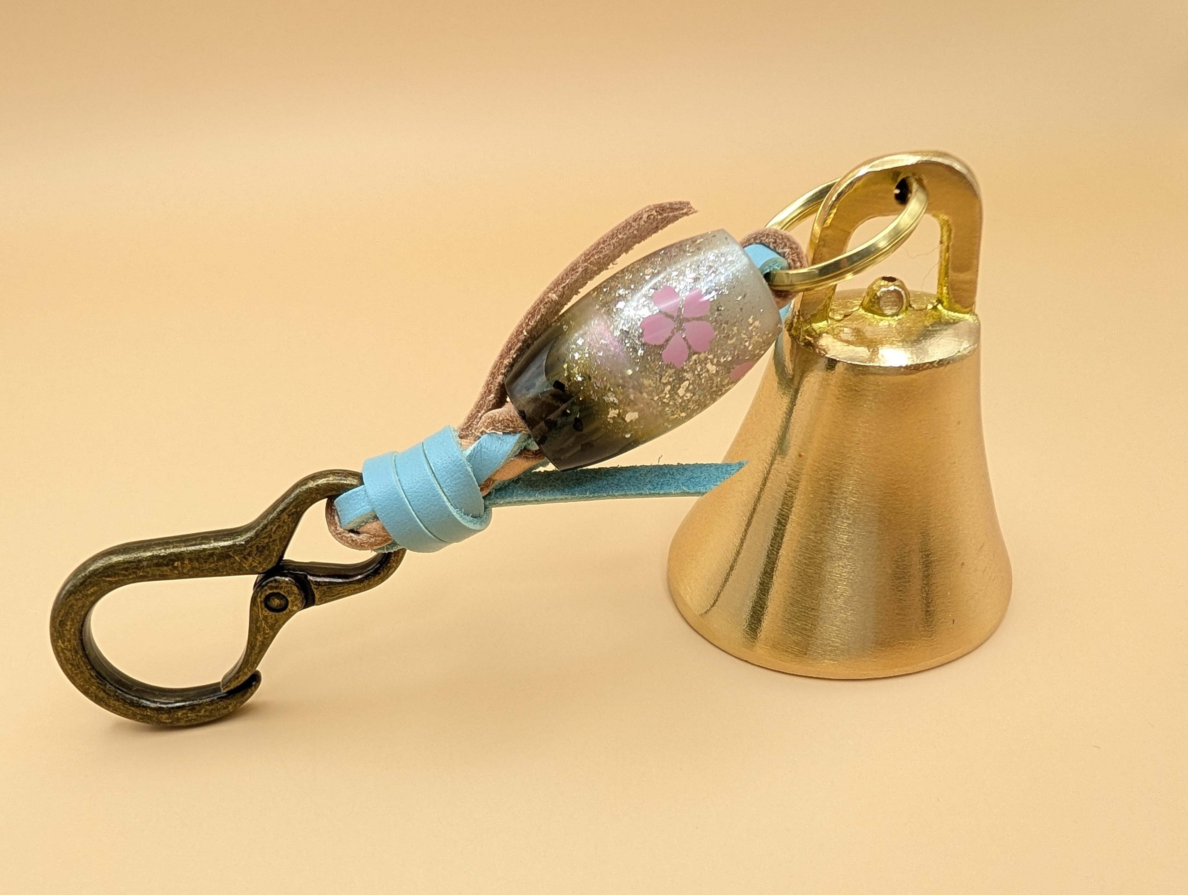 全長約19cm ベル直径5cm レザー紐(水色×ナチュラル) レジン製蜻蛉玉 カラビナ(アンティークゴールド)