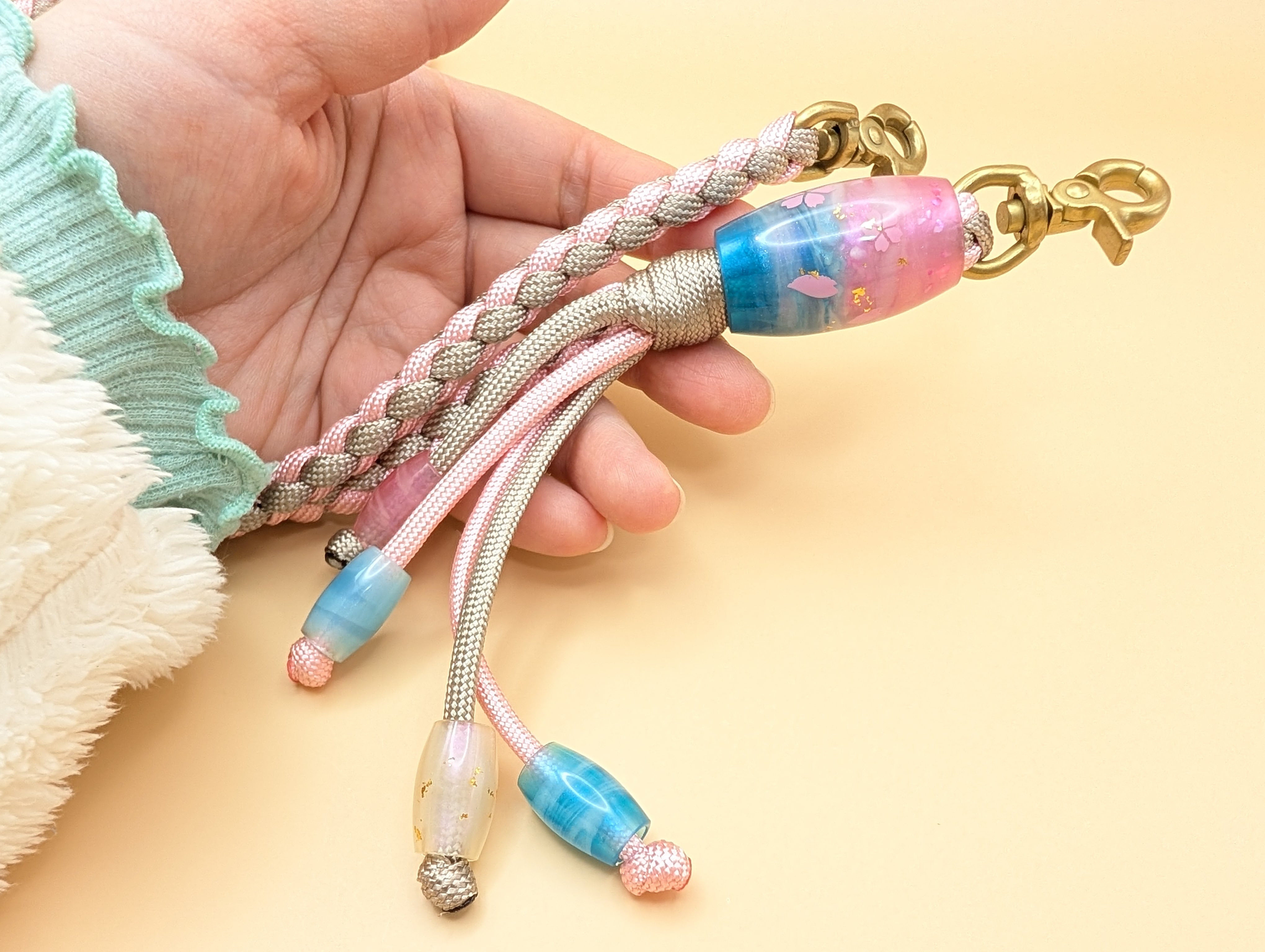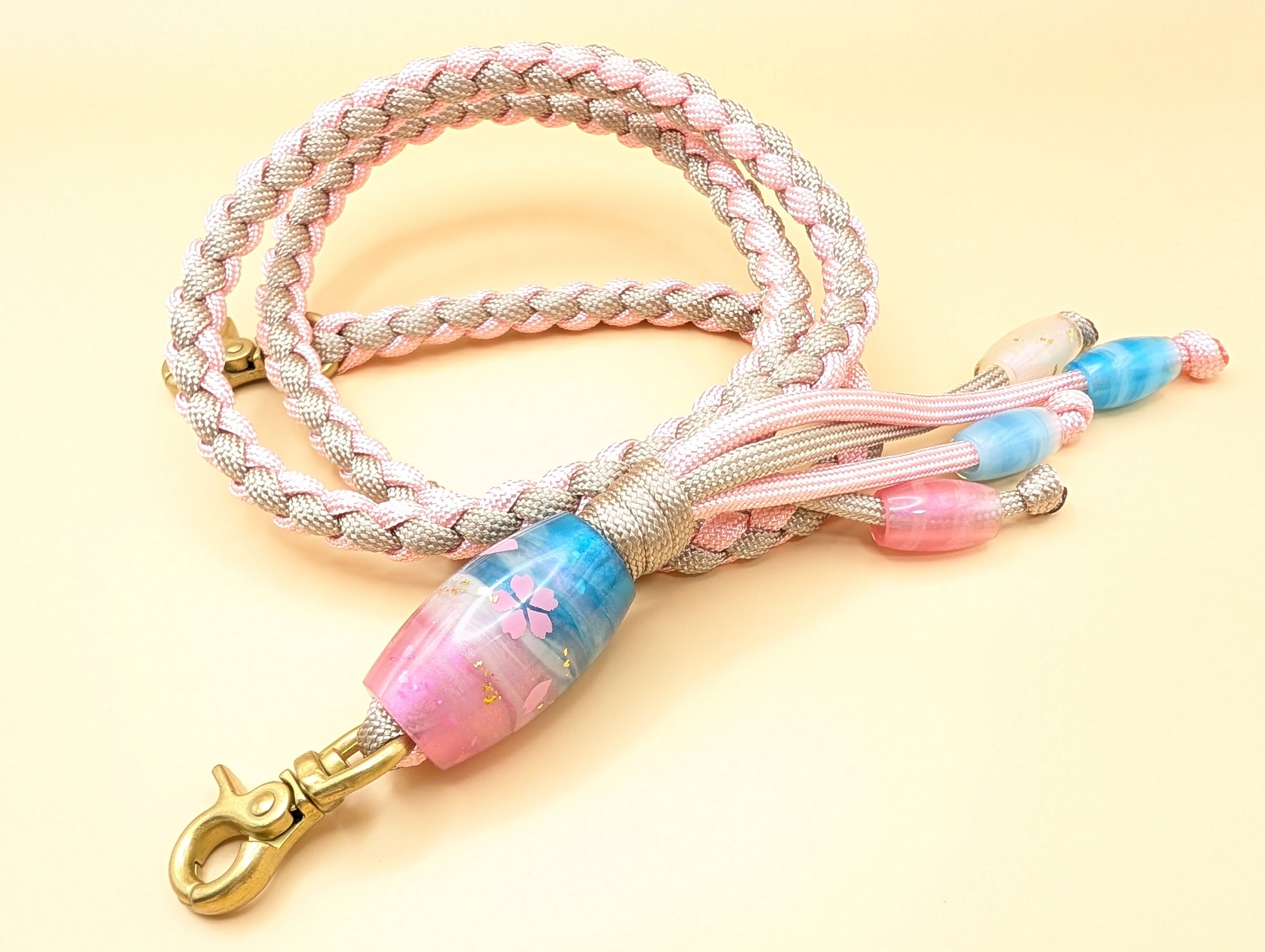 全長90cm パラコード紐(さくら×グレージュ) レジン製蜻蛉玉 レバー付きナスカン金具(真鍮ゴールド色)