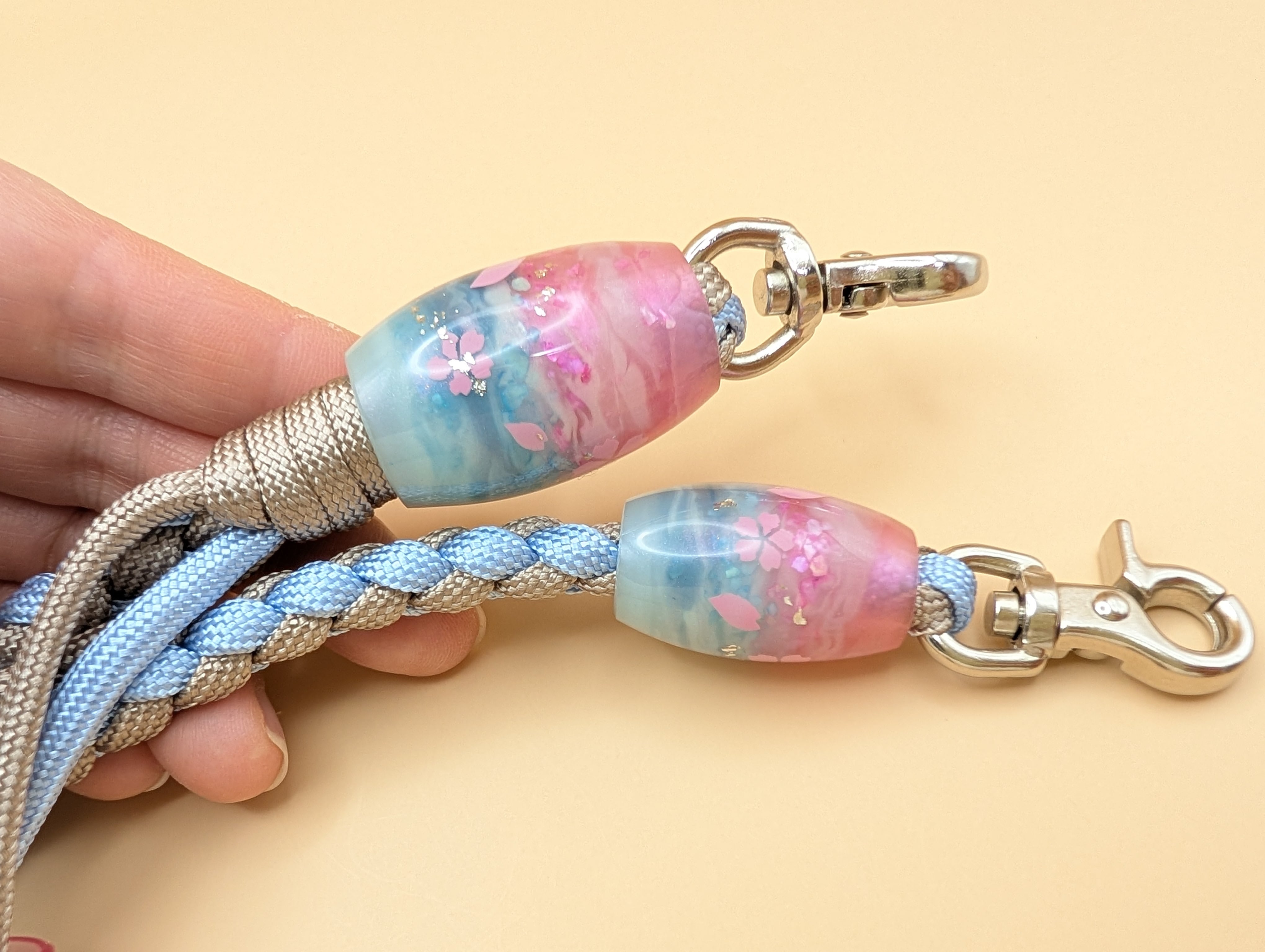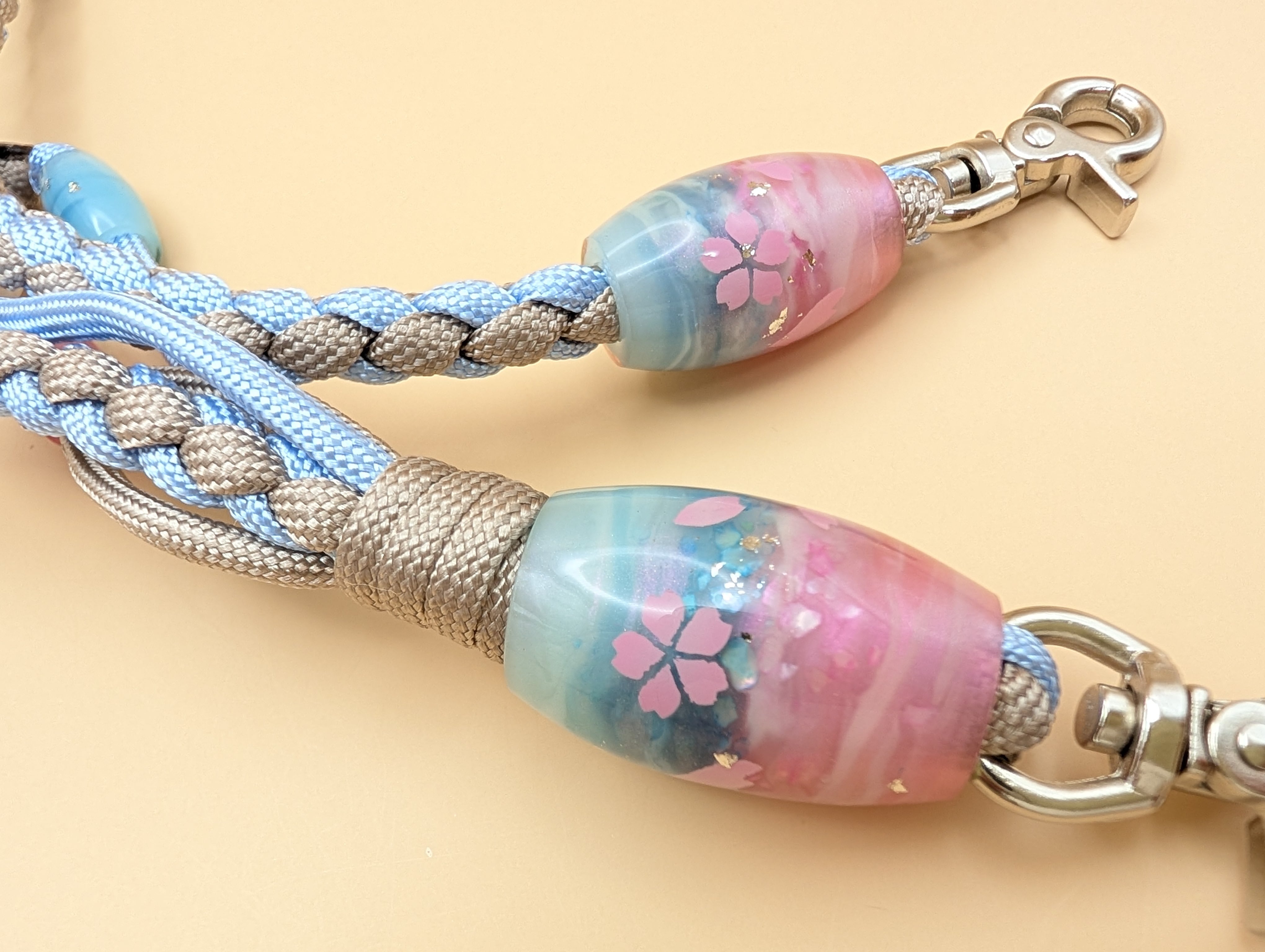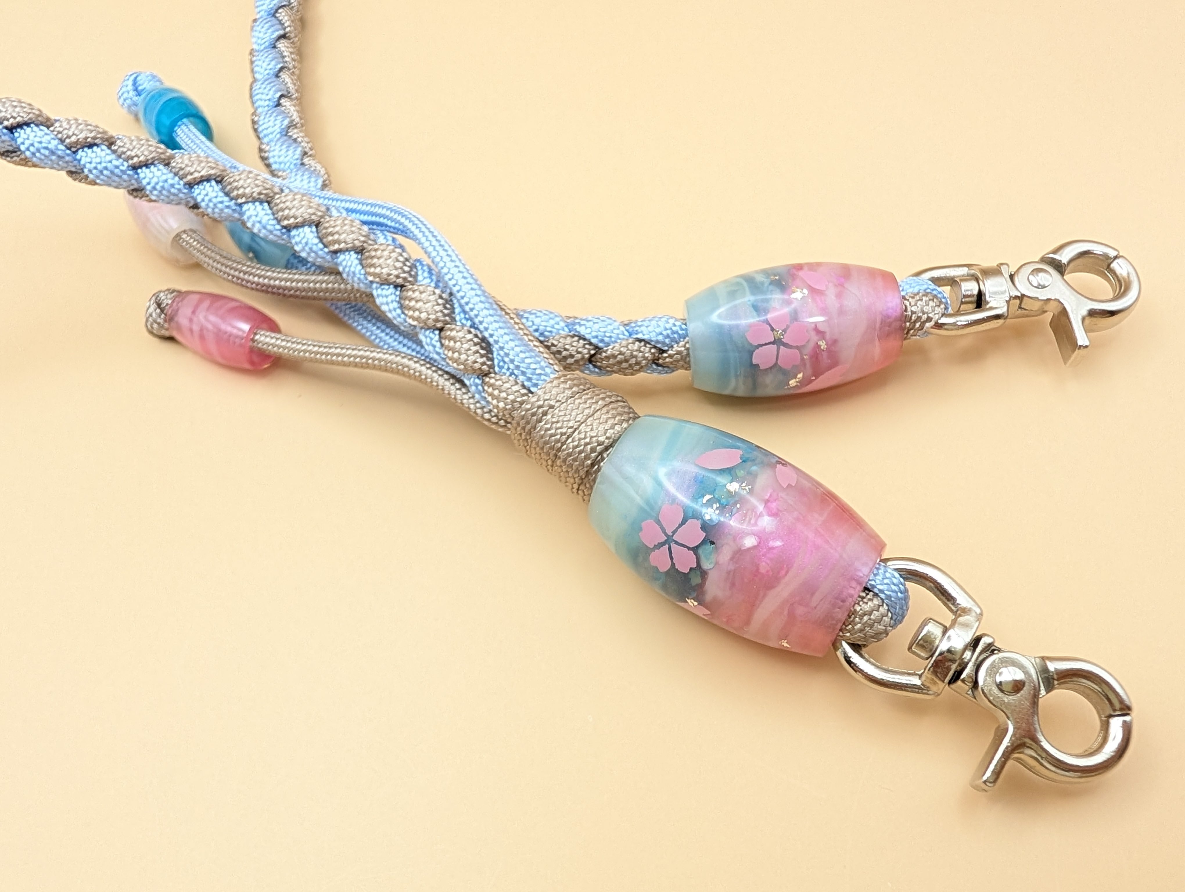 全長89cm パラコード紐(水色×グレージュ) レジン製蜻蛉玉 レバー付きナスカン金具(シルバー)