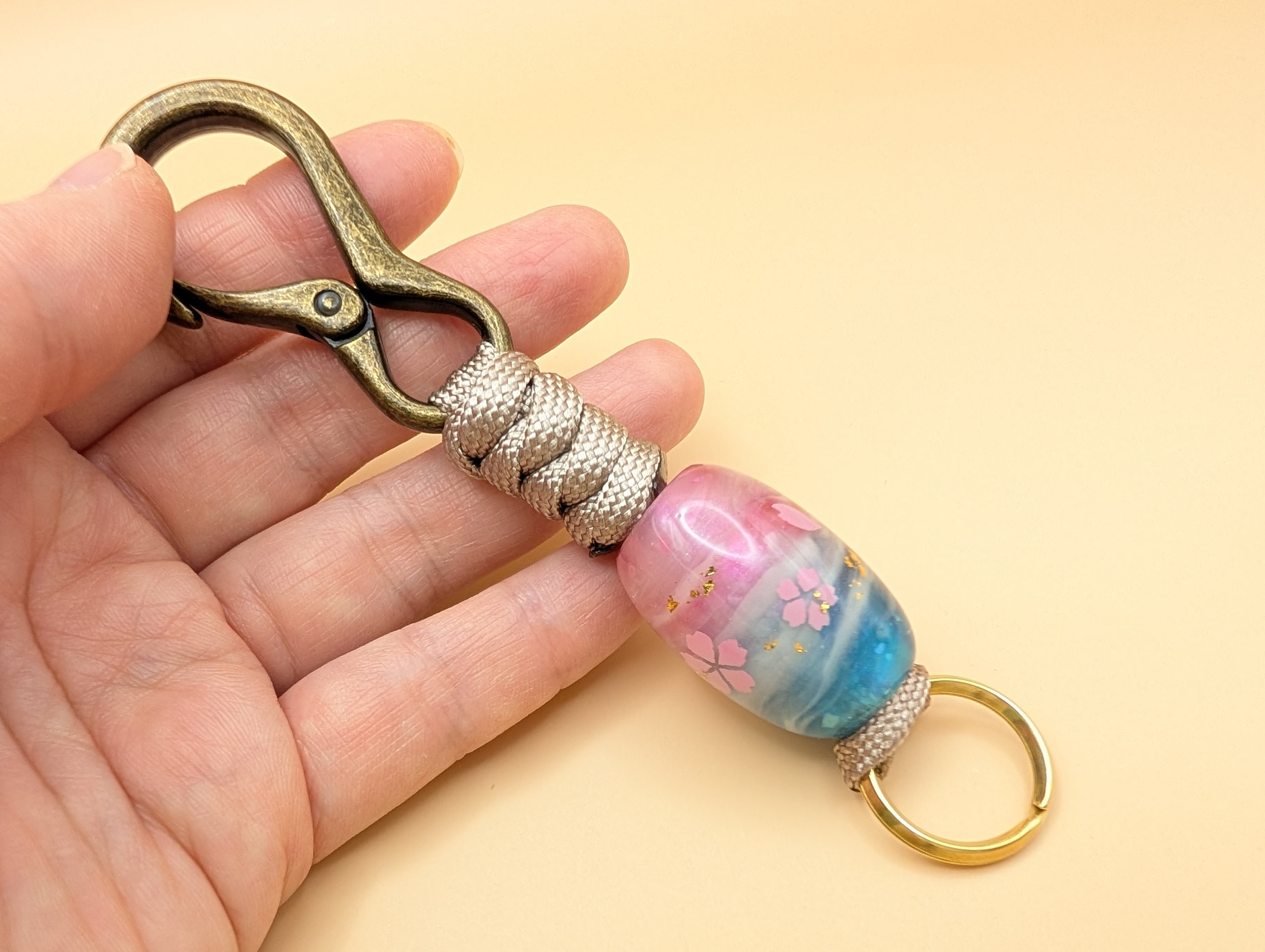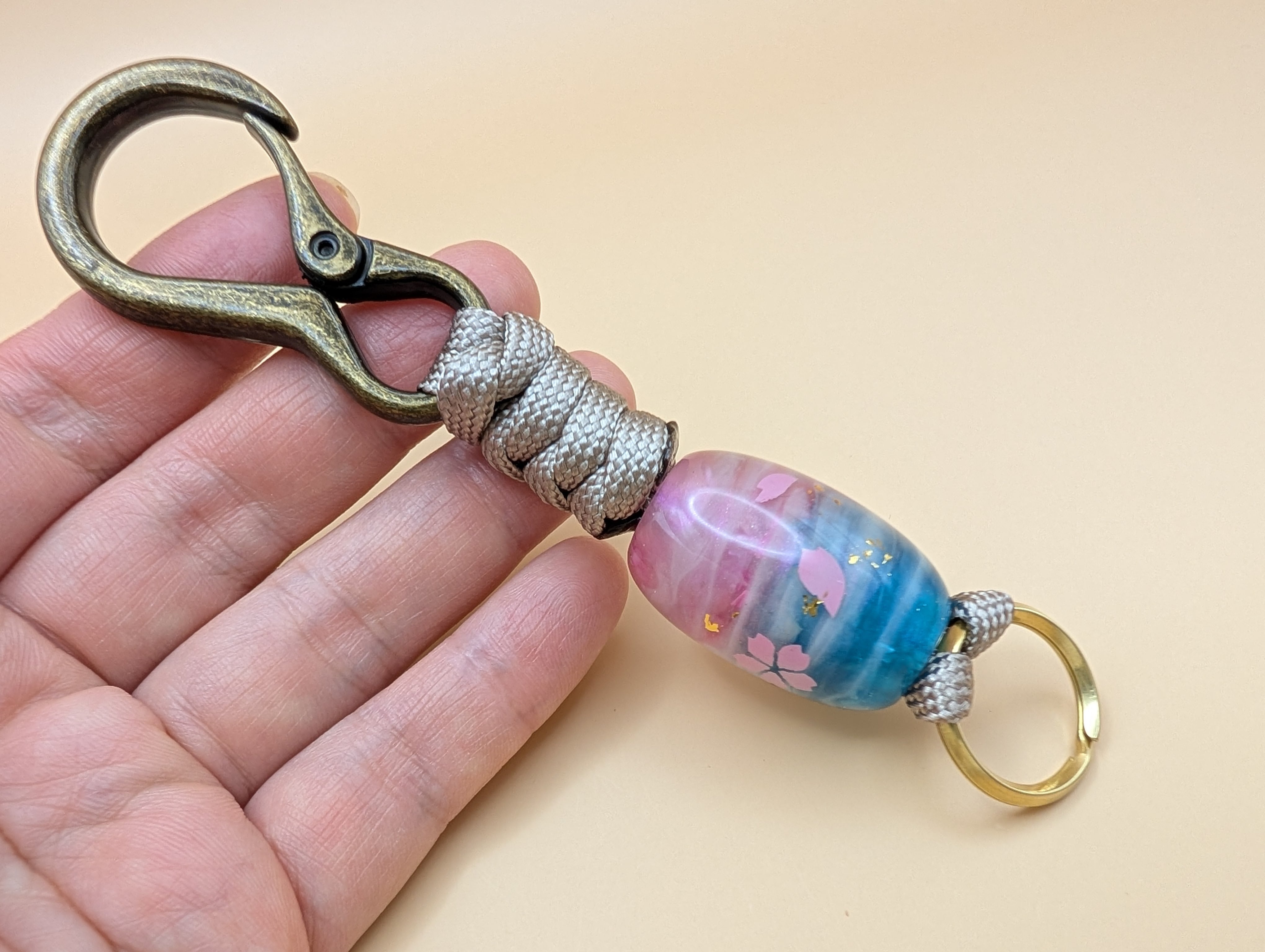 全長約12.5cm パラコード紐(グレージュ) レジン製蜻蛉玉 カラビナ(アンティークゴールド) 真鍮二重リング