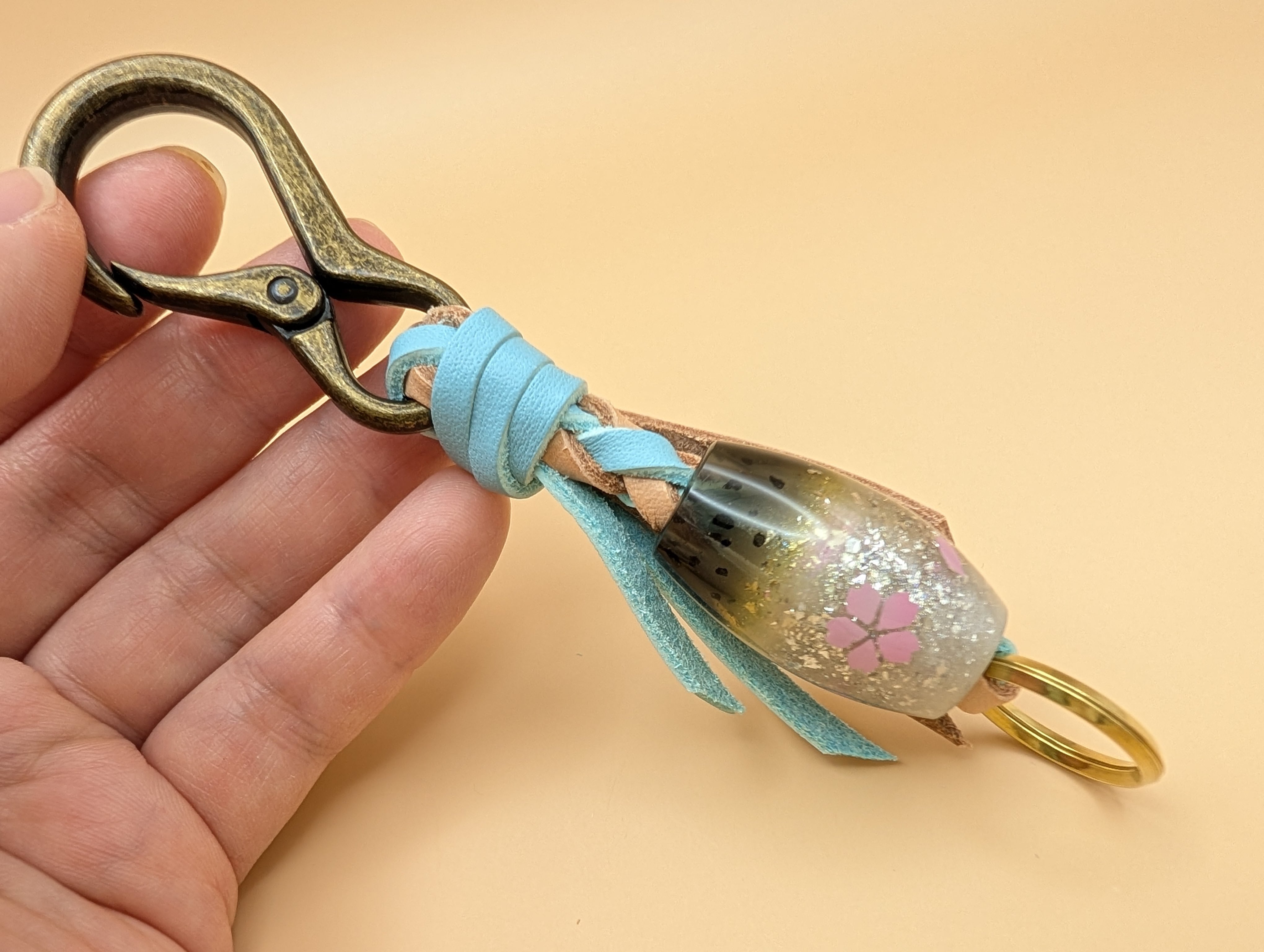 全長約12.5cm レザー紐(水色×ナチュラル) レジン製蜻蛉玉 カラビナ(アンティークゴールド)