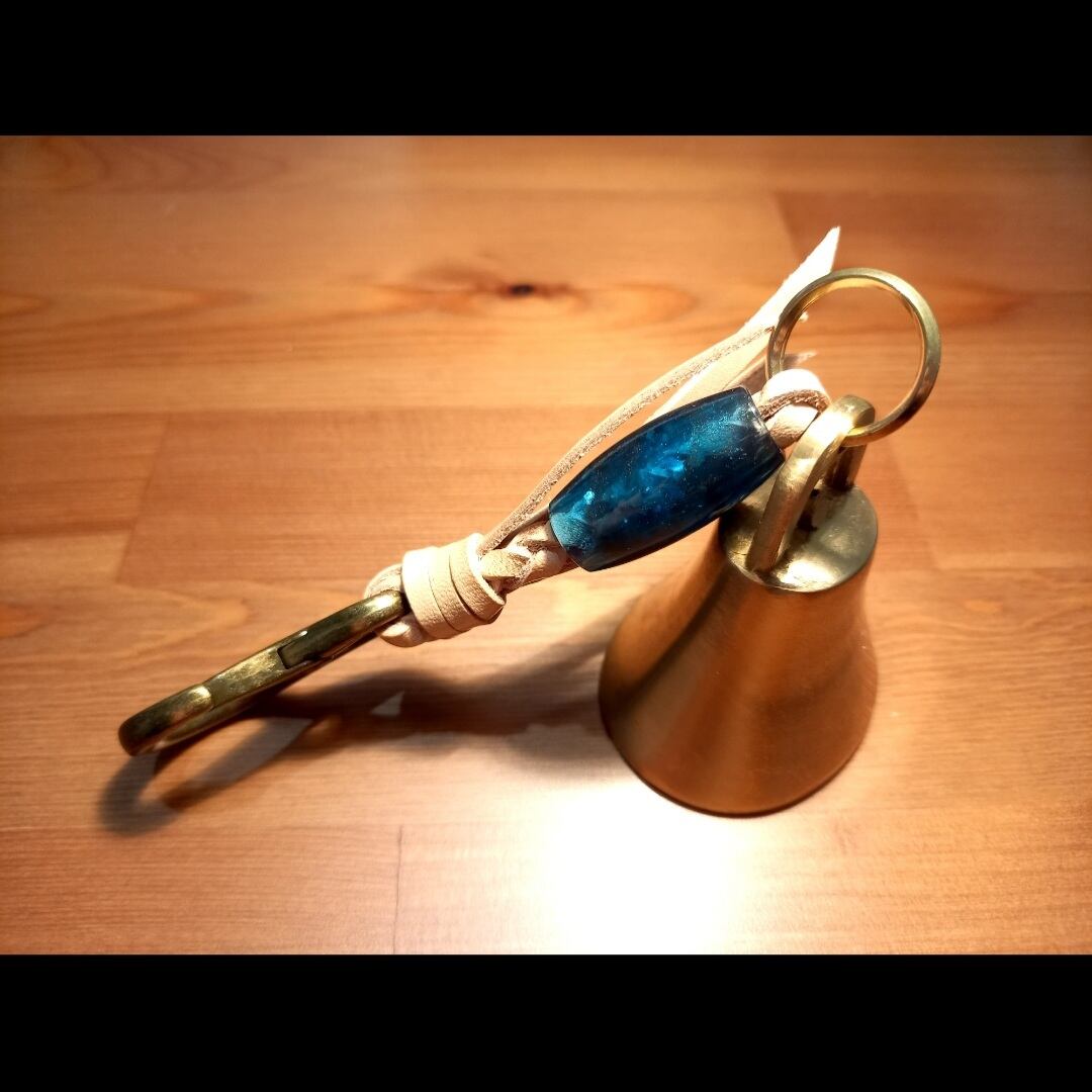 全長約19cm ベル直径5cm 革紐(ナチュラル) レジン製蜻蛉玉 カラビナ(アンティークゴールド色)