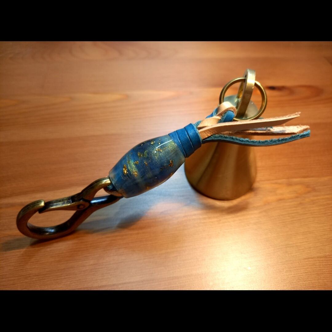 全長約18cm ベル直径5cm レザー紐(ナチュラル×ターコイズ) レジン製蜻蛉玉 カラビナ(アンティークゴールド)