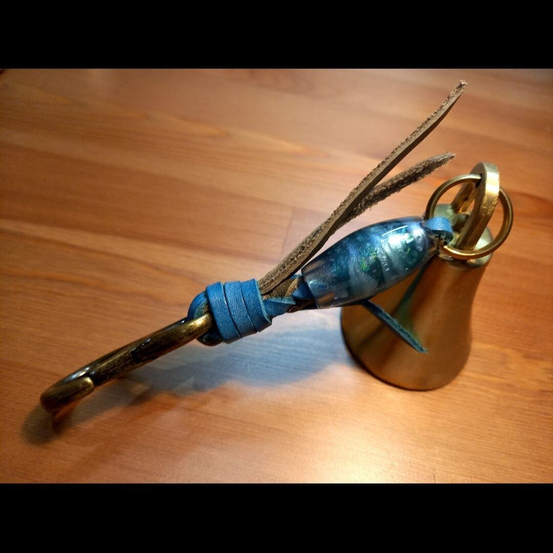 全長約19cm ベル直径5cm レザー紐(ターコイズ×カーキ) レジン製蜻蛉玉 カラビナ(アンティークゴールド)