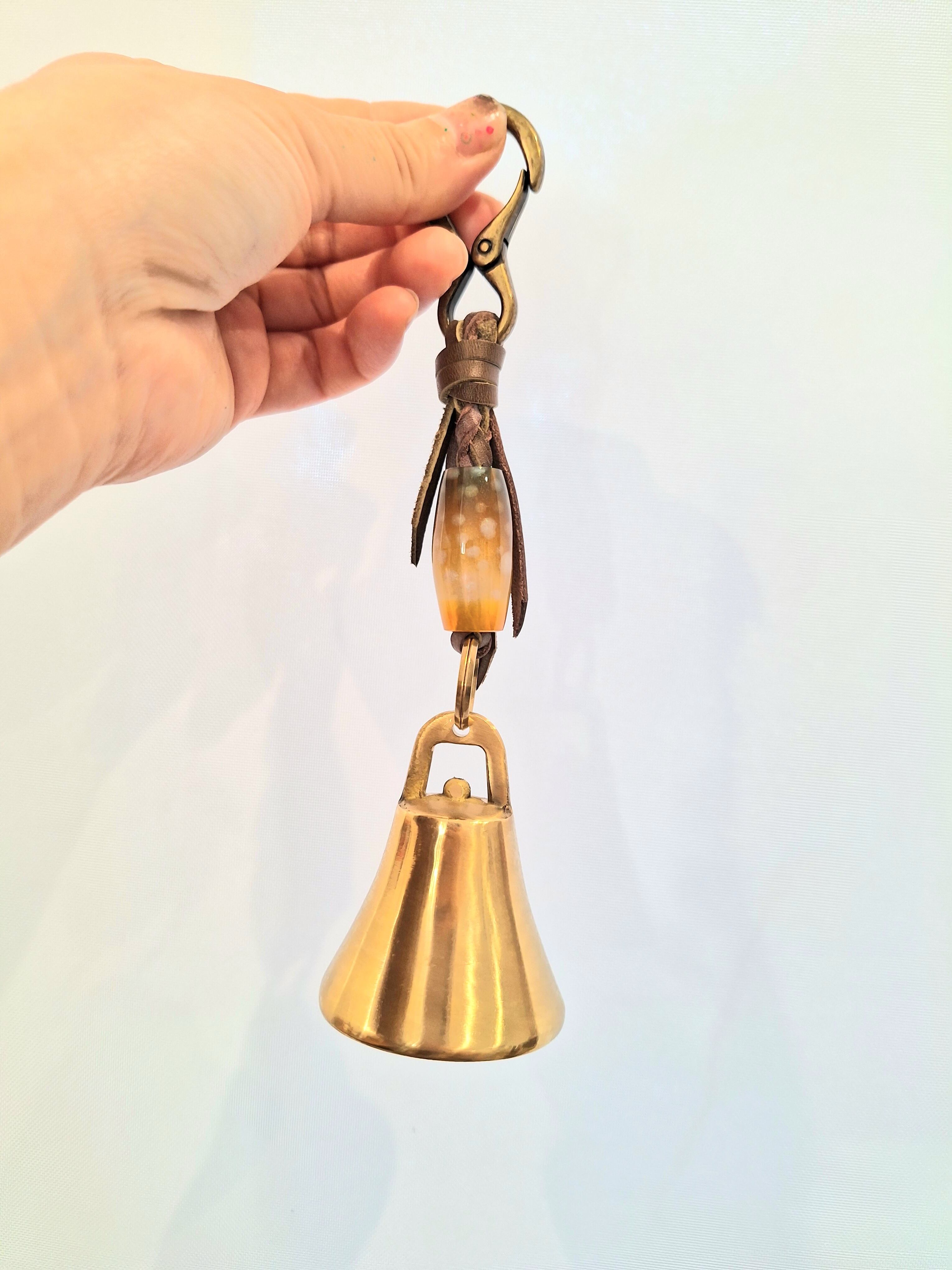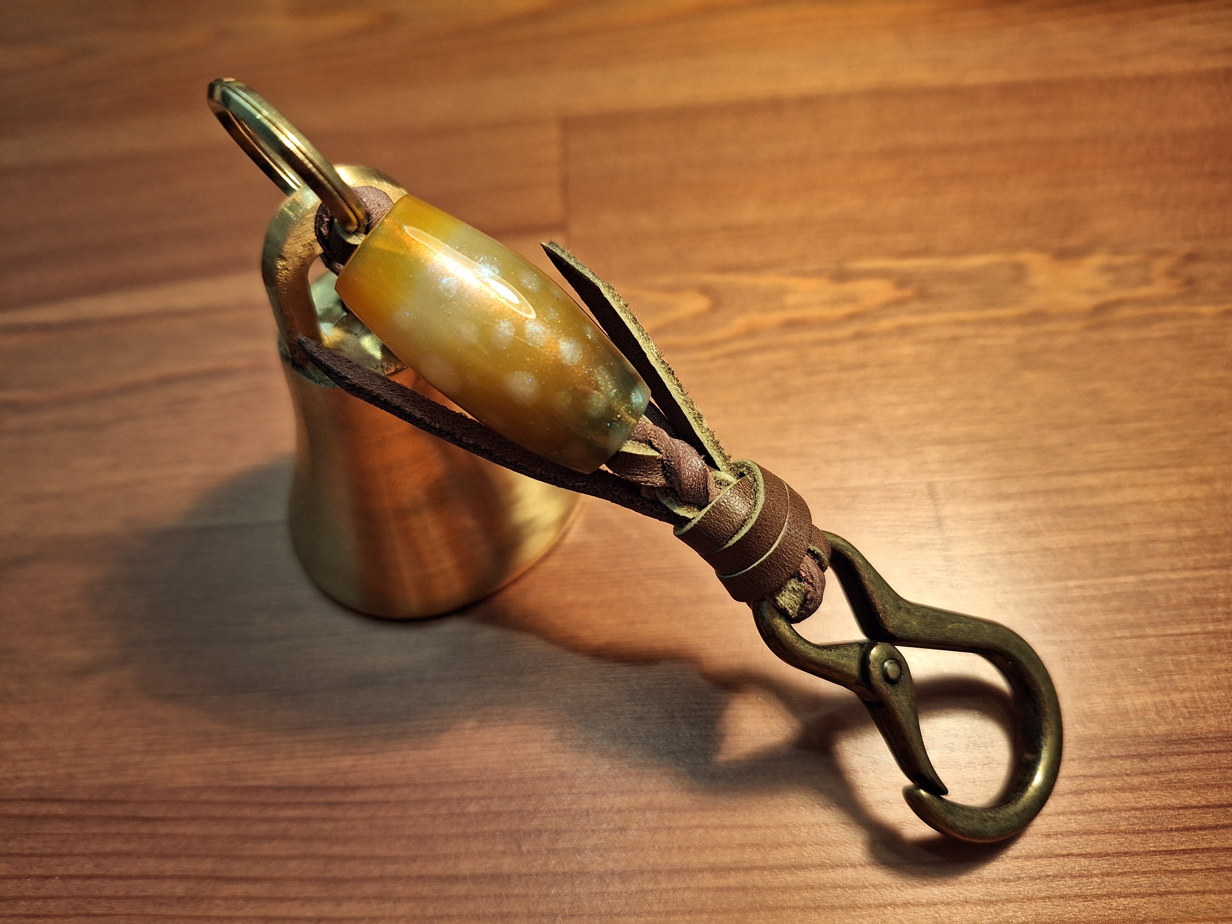 全長約19cm ベル直径5cm レザー紐(濃茶×カーキ) レジン製蜻蛉玉 カラビナ(アンティークゴールド)