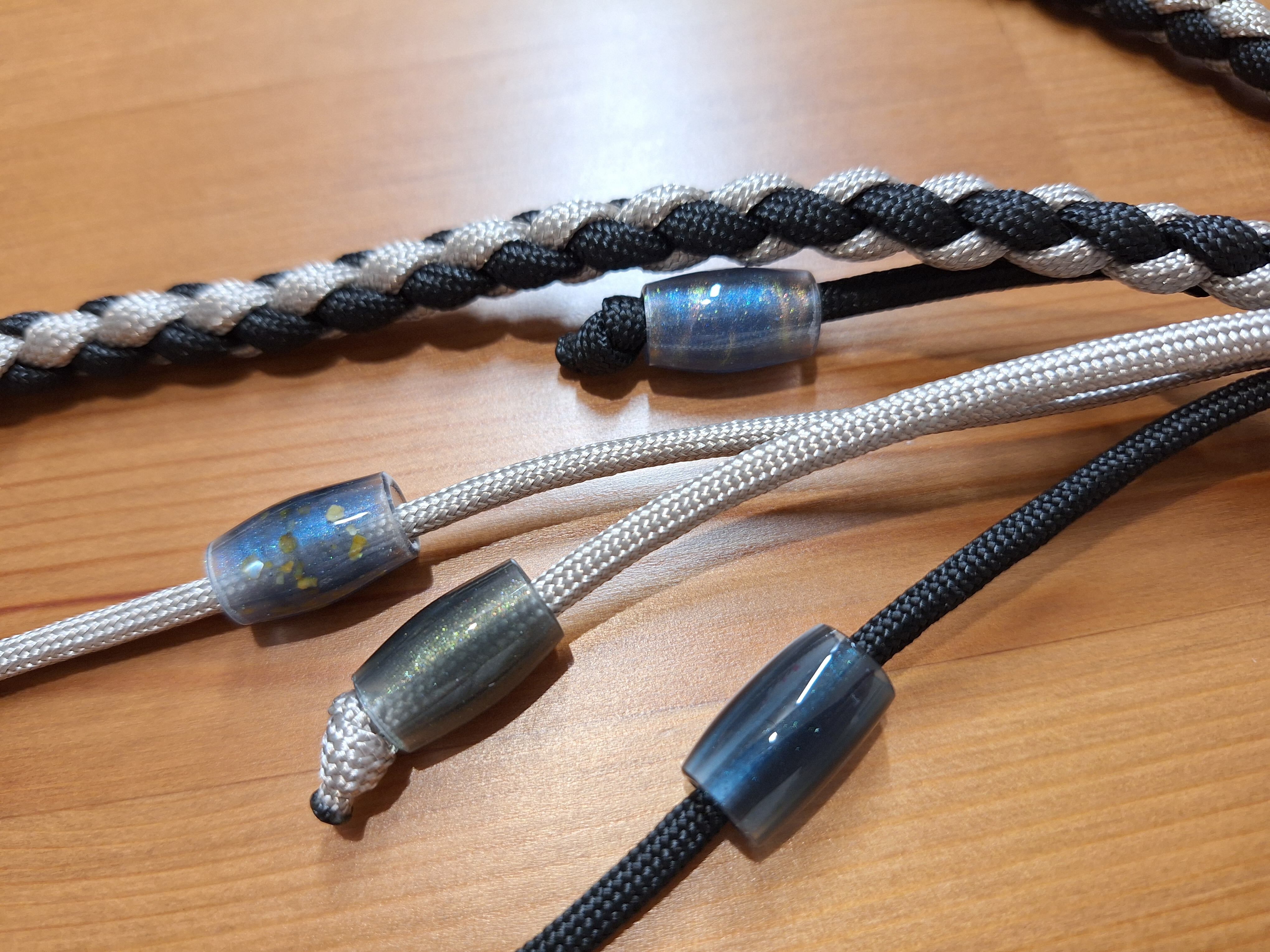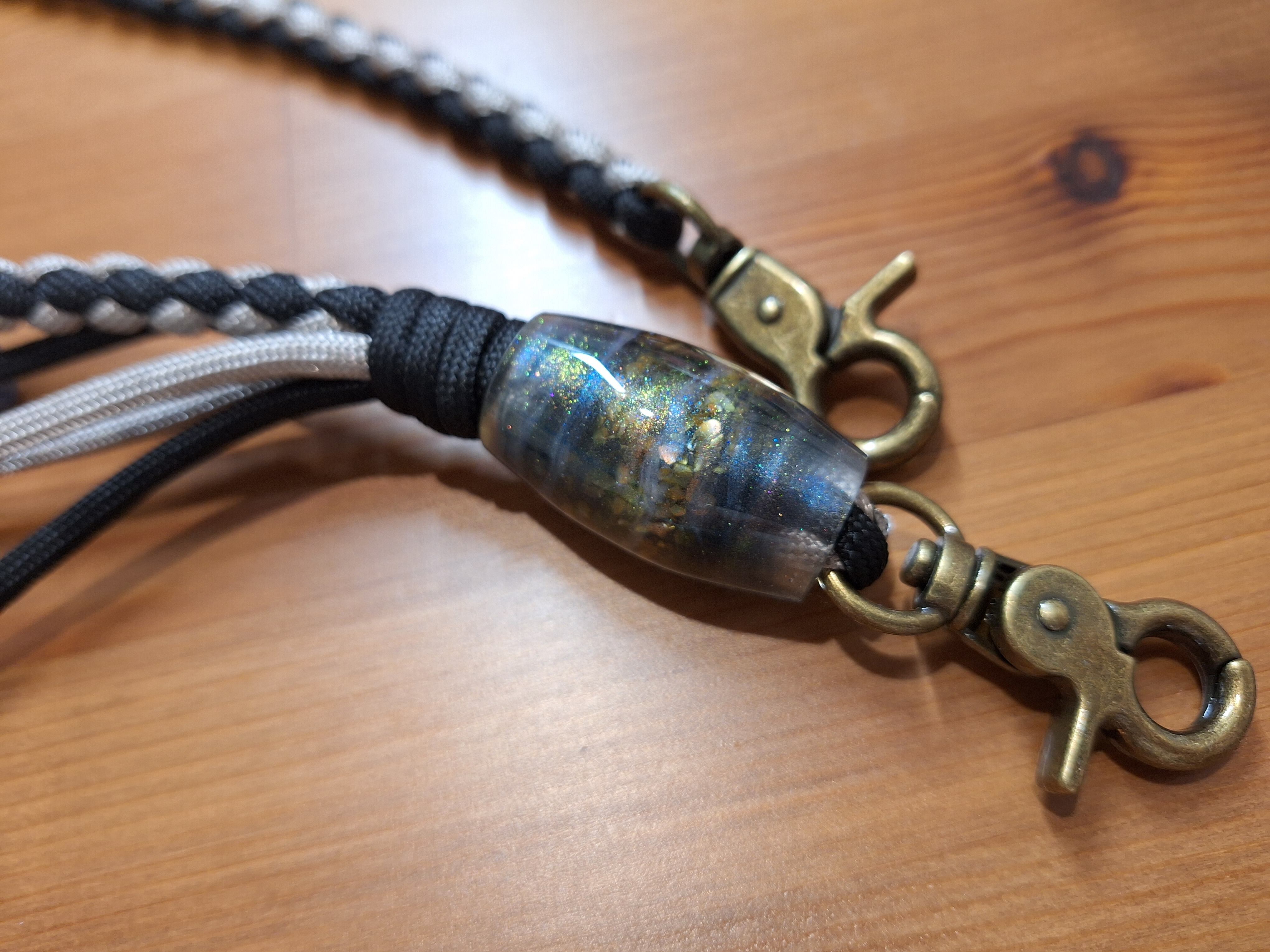 全長81cm パラコード紐(黒×サンドベージュ) レジン製蜻蛉玉 レバー付きナスカン金具(アンティークゴールド色)
