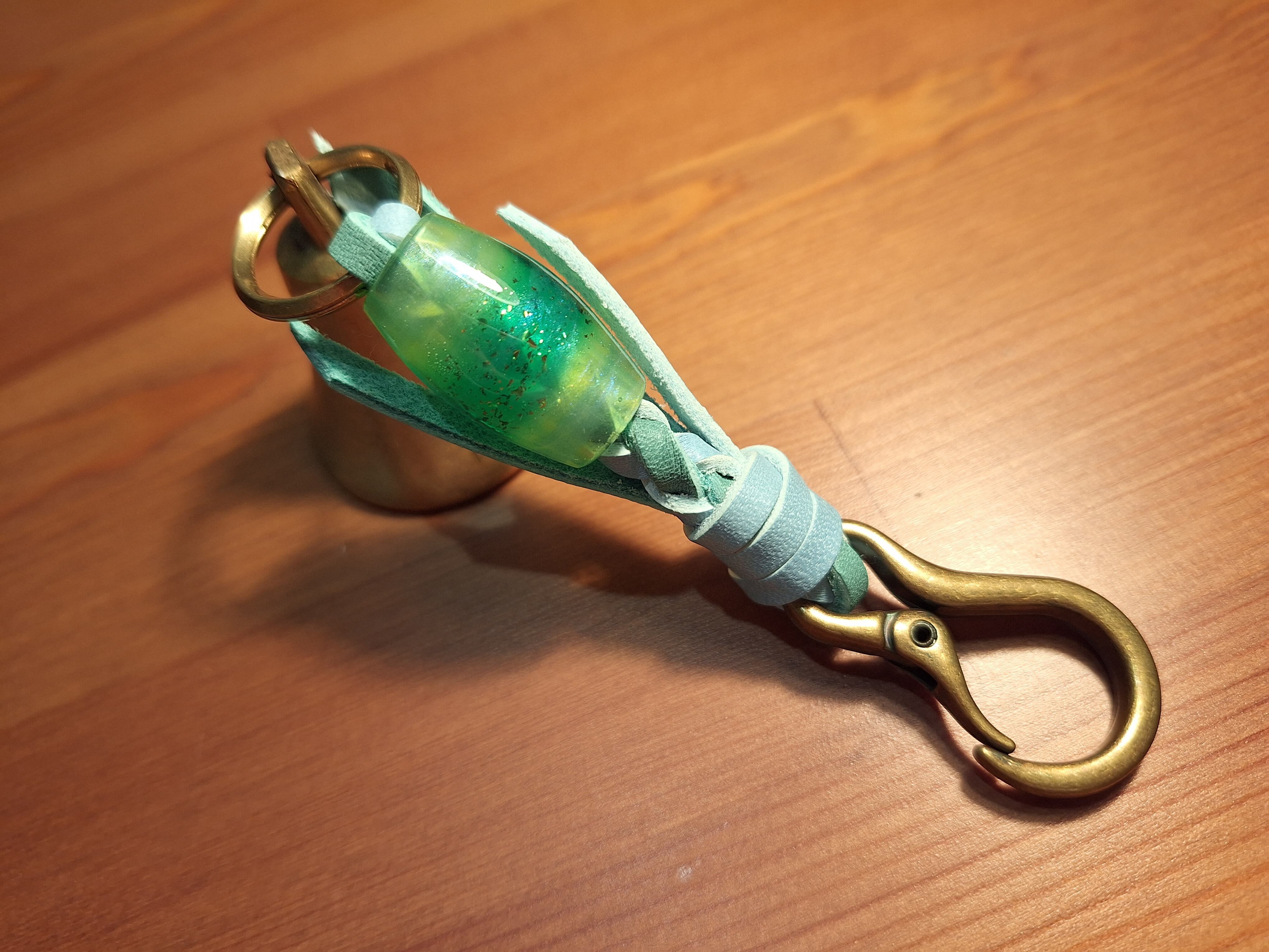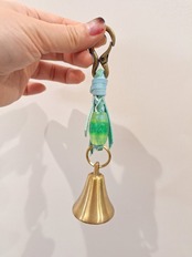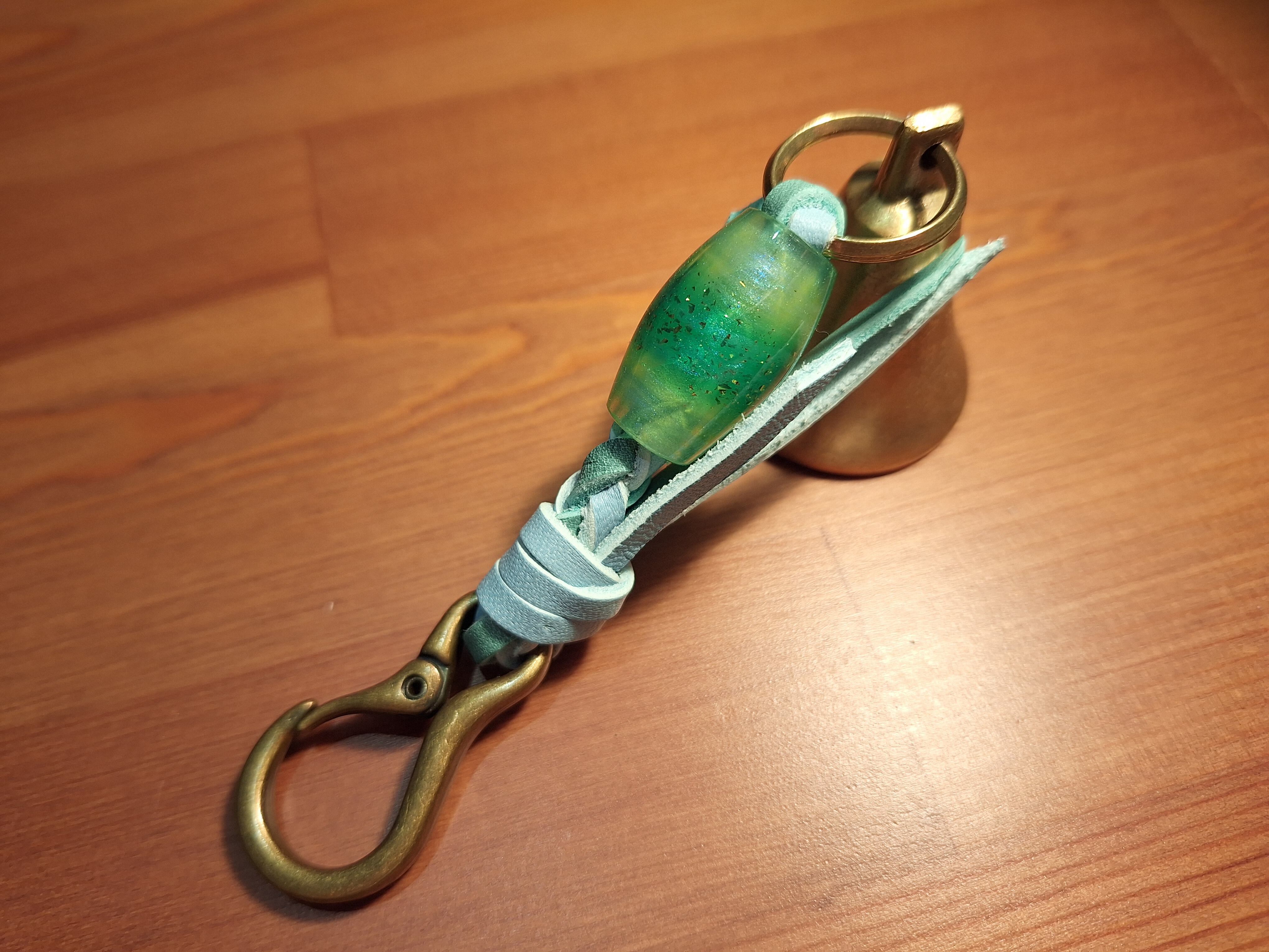 全長約14cm ベル直径3.5cm レザー紐(水色×エメラルド) レジン製蜻蛉玉 カラビナ(アンティークゴールド)