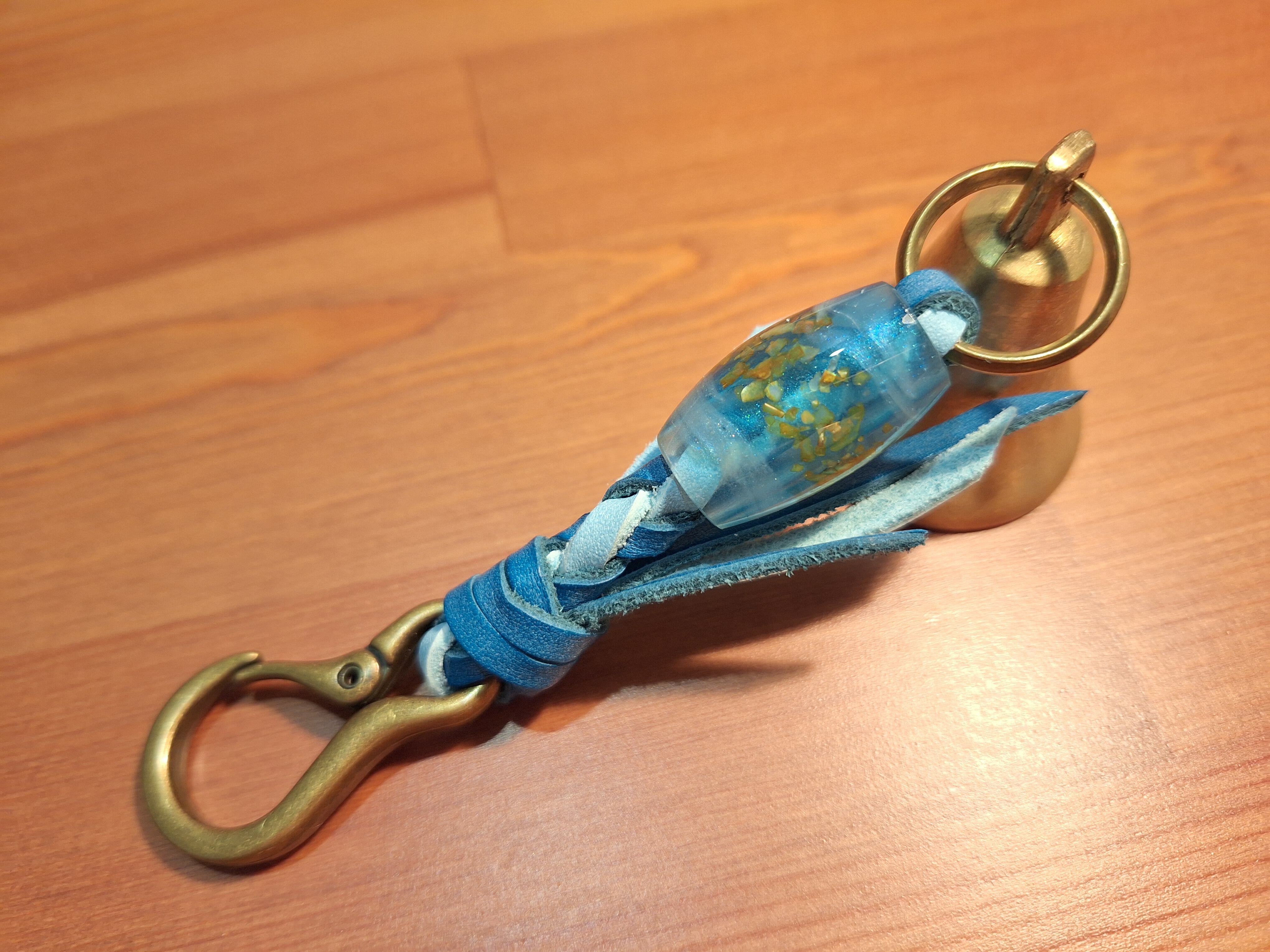 全長約14cm ベル直径3.5cm レザー紐(水色×青) レジン製蜻蛉玉 カラビナ(アンティークゴールド)