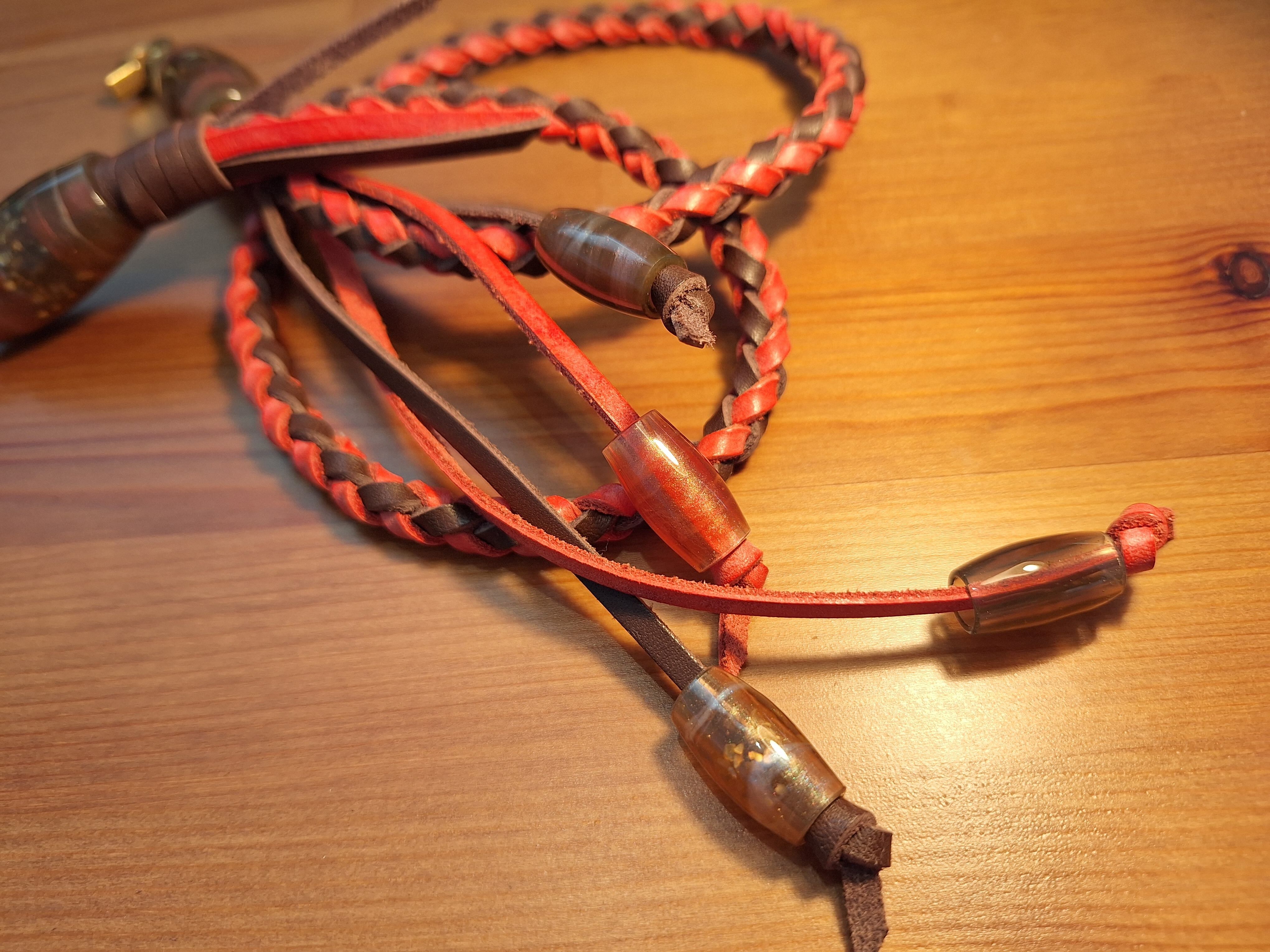 全長70cm レザー紐(濃茶×赤) レジン製蜻蛉玉 レバー付きナスカン金具(真鍮アンティークゴールド色)
