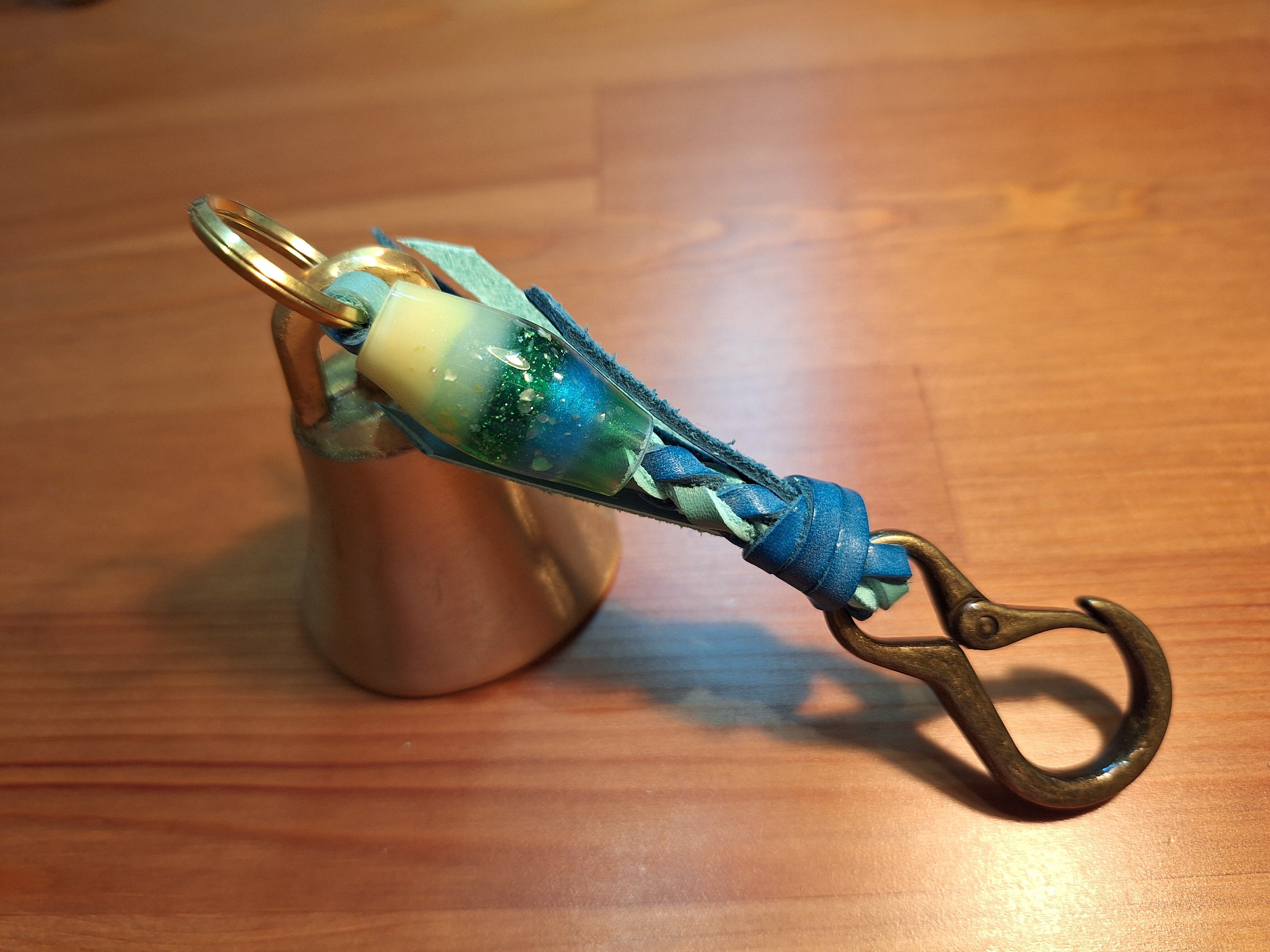 全長約19cm ベル直径5cm レザー紐(エメラルド×ターコイズ) レジン製蜻蛉玉 カラビナ(アンティークゴールド)