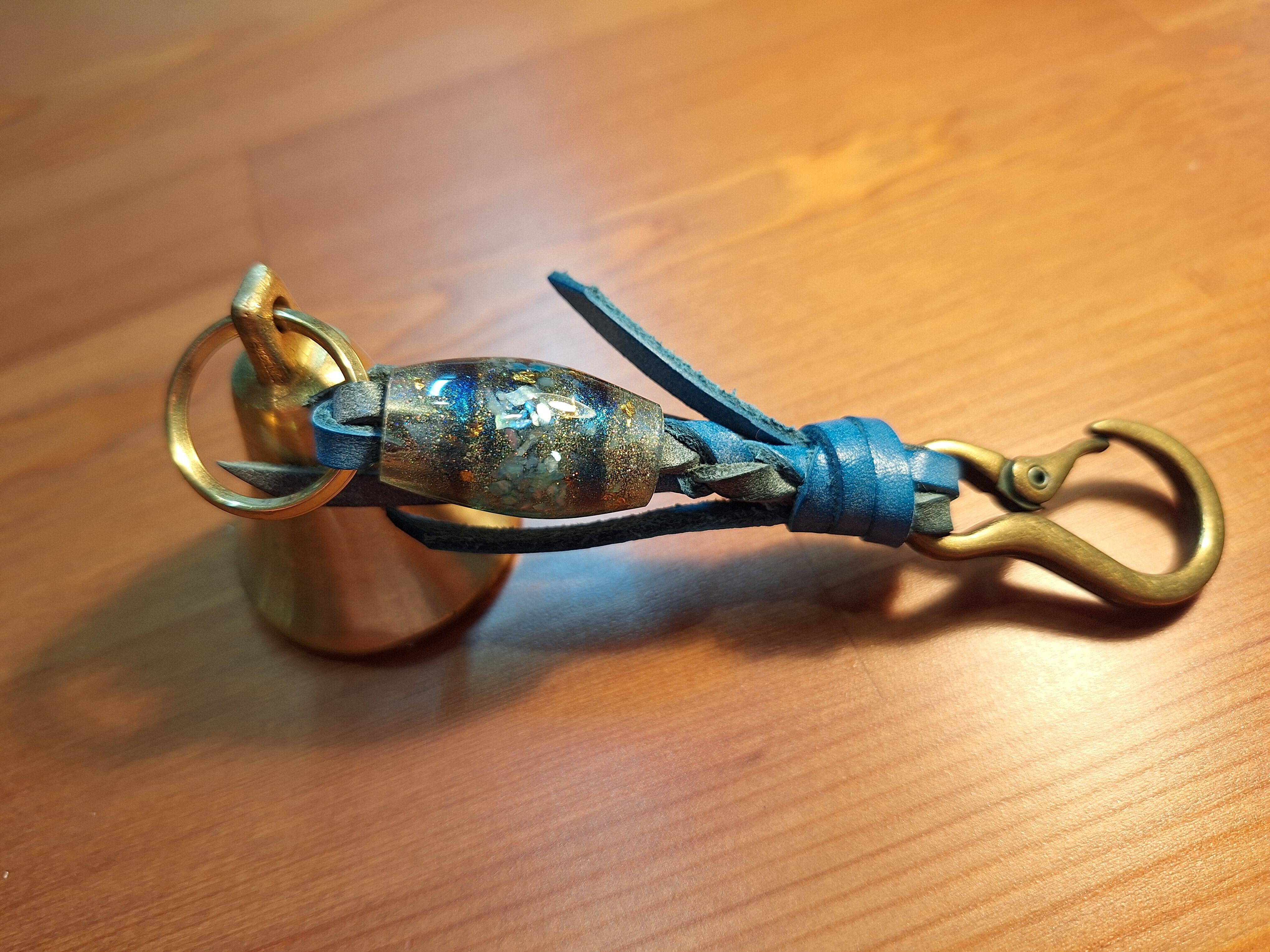 全長約14cm ベル直径3.5cm レザー紐(ターコイズ×フォレストグリーン) レジン製蜻蛉玉 カラビナ(アンティークゴールド)
