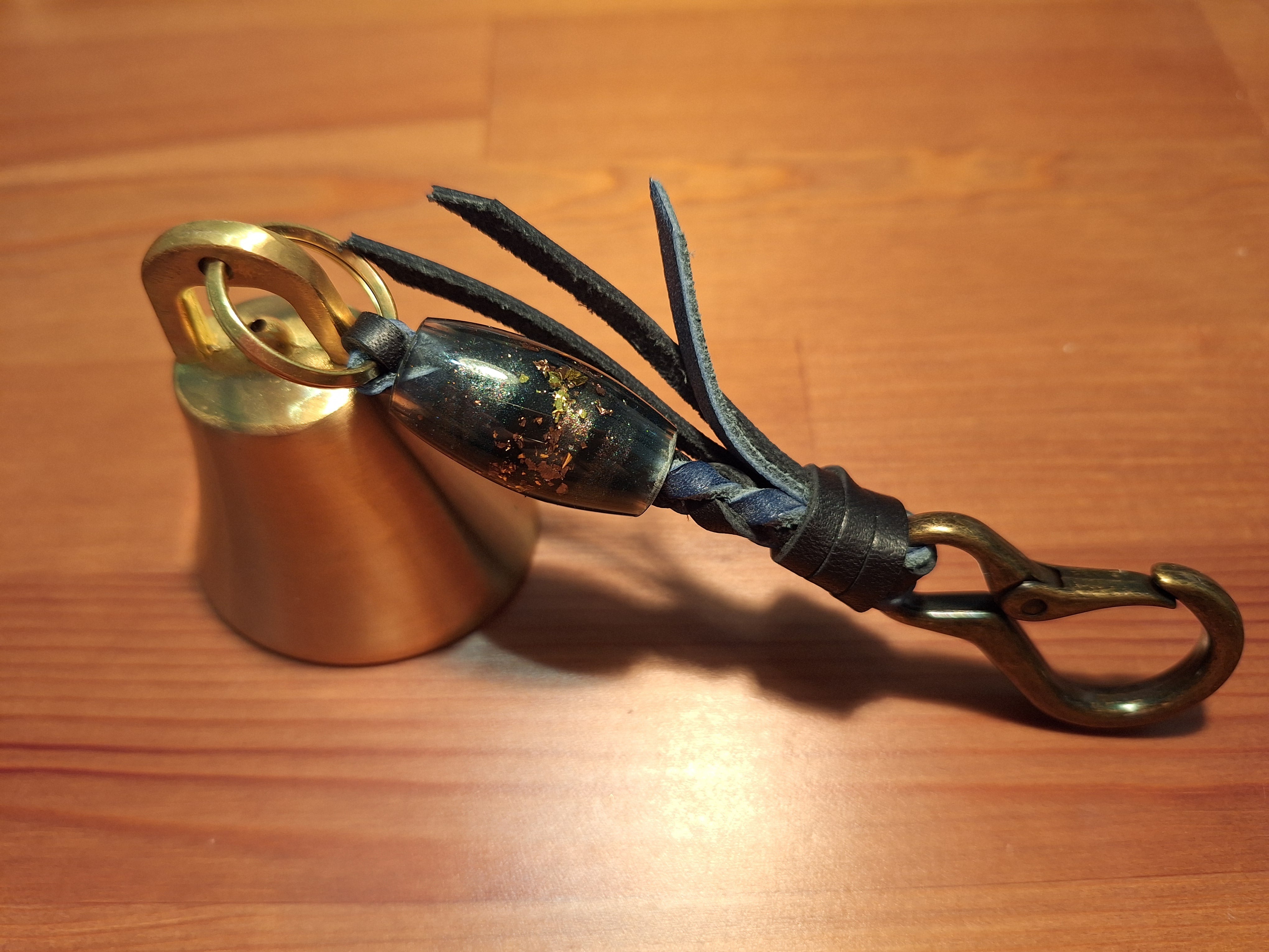 全長約19cm ベル直径5cm レザー紐(ブルー×ブラック) レジン製蜻蛉玉 カラビナ(アンティークゴールド)