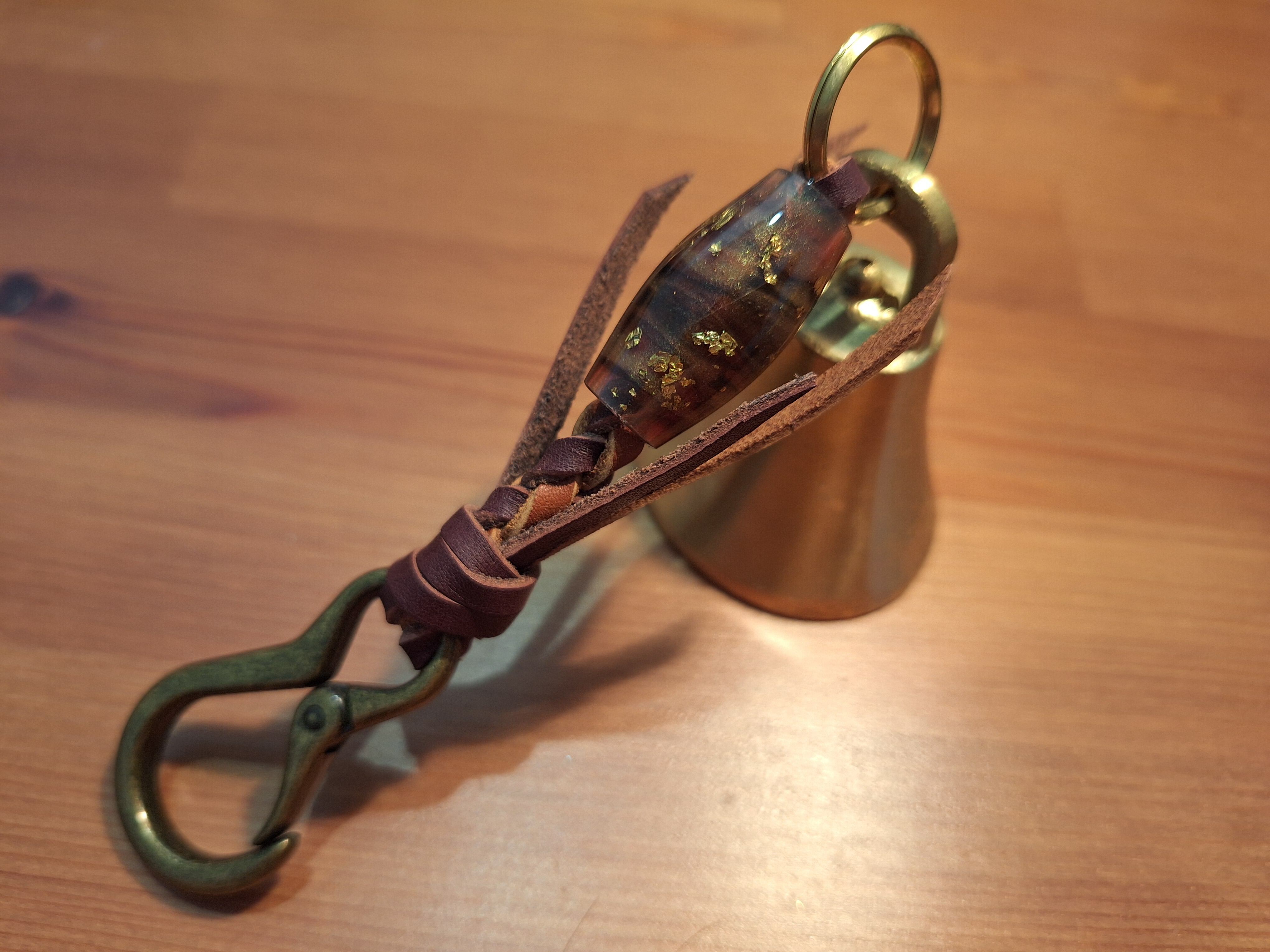 全長約19cm ベル直径5cm レザー紐(ブルー×ブラック) レジン製蜻蛉玉 カラビナ(アンティークゴールド)