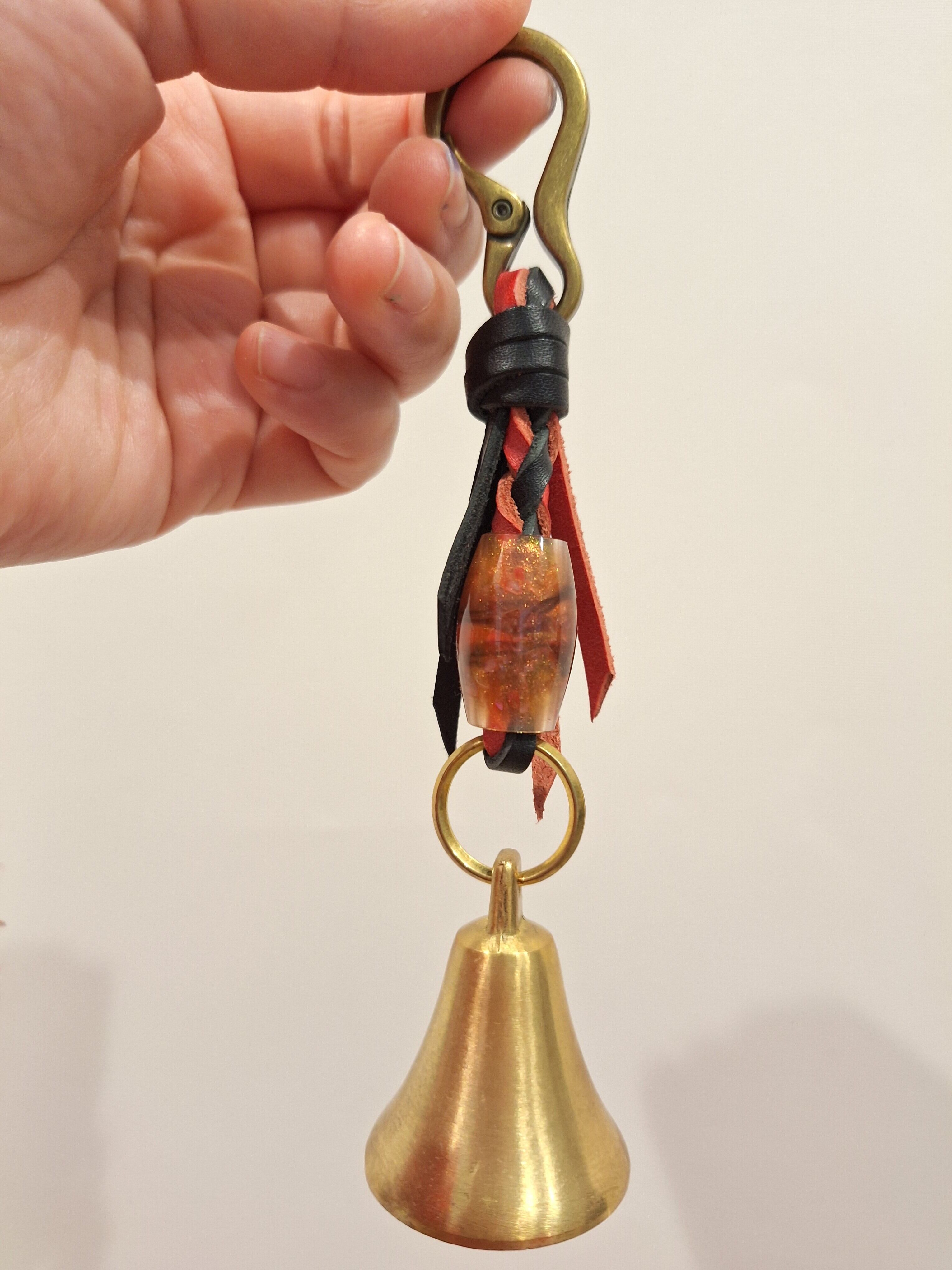 全長約14cm ベル直径3.5cm レザー紐(黒×赤) レジン製蜻蛉玉 カラビナ(アンティークゴールド)