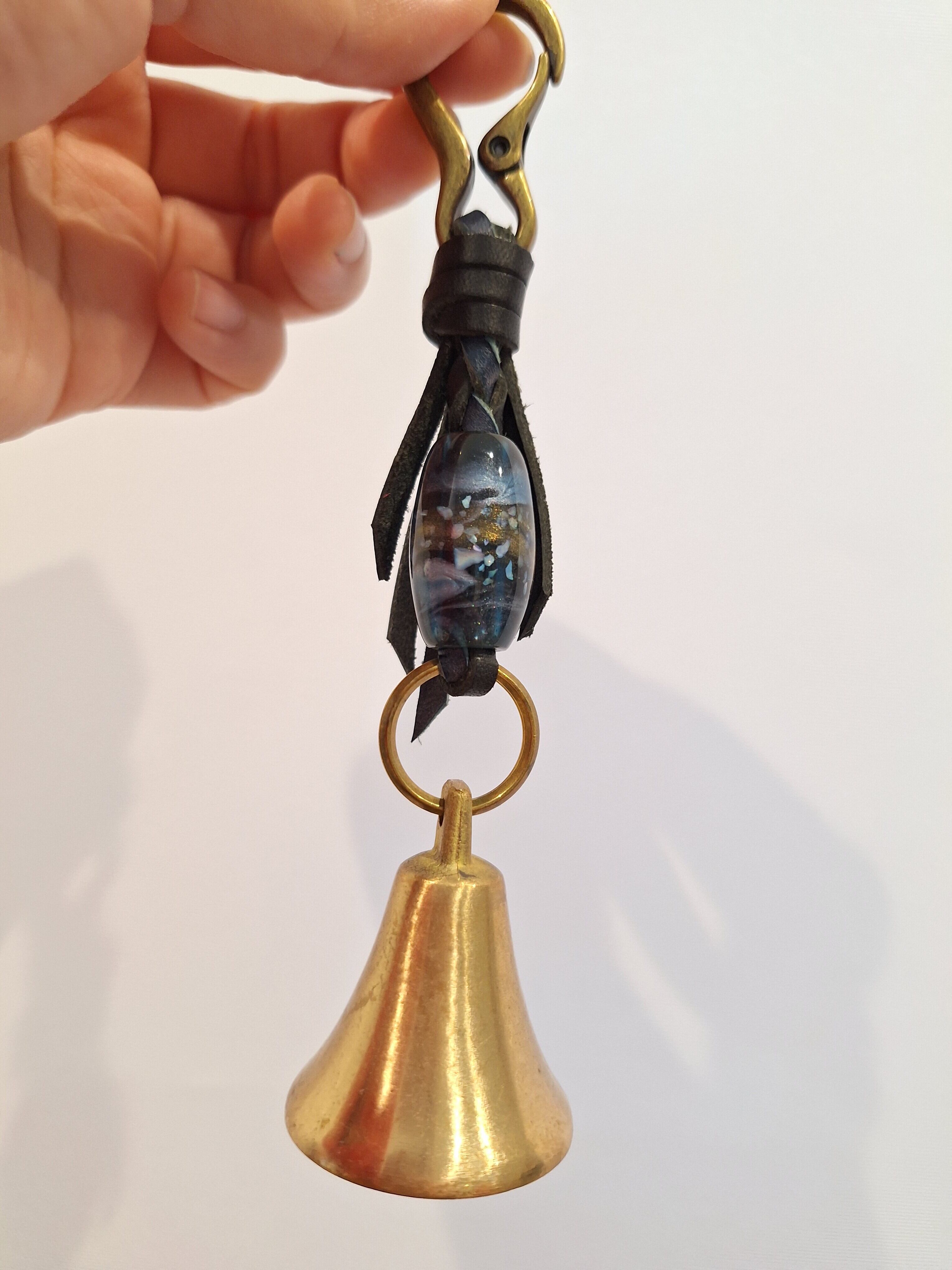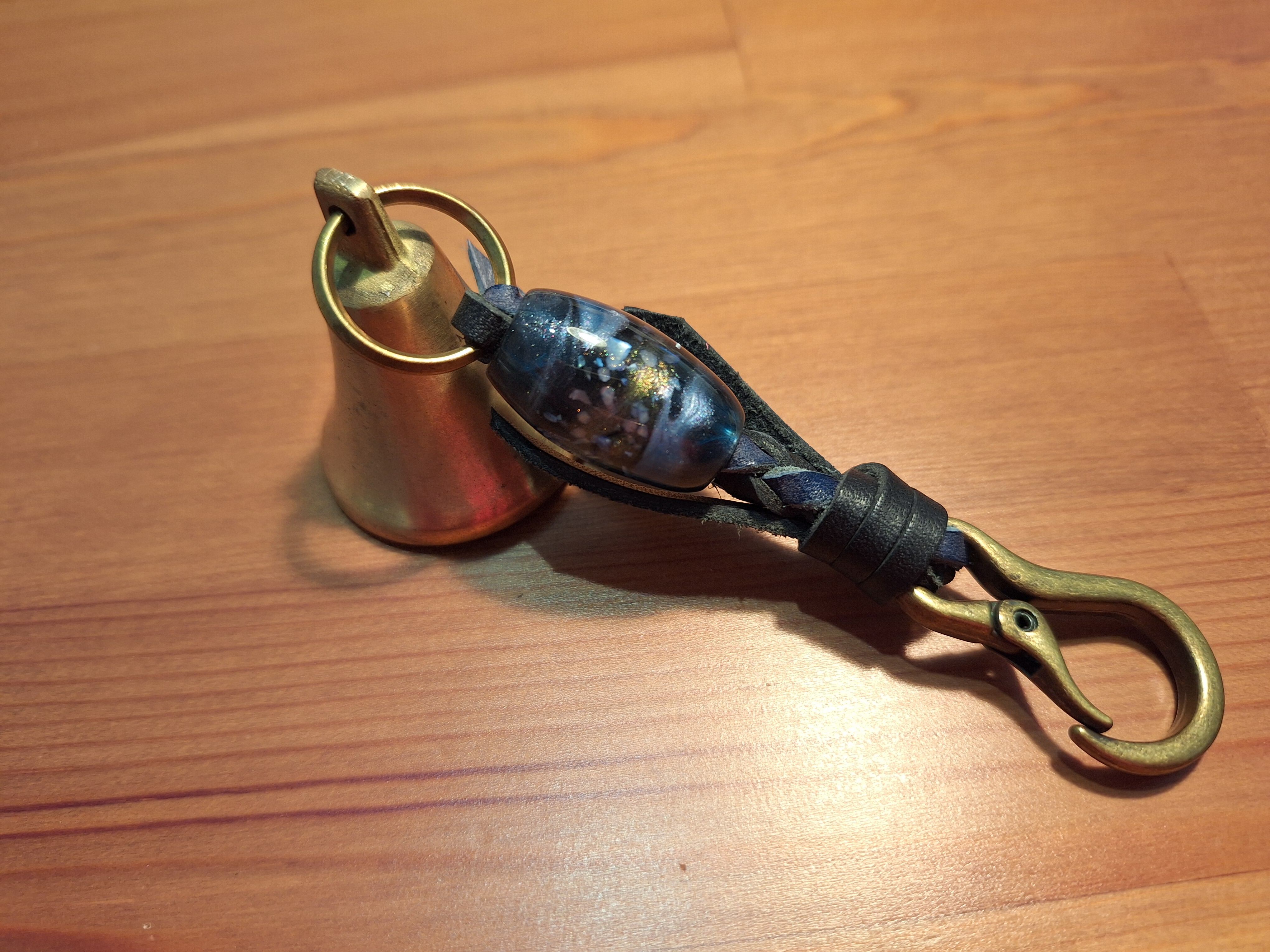 全長約14cm ベル直径3.5cm レザー紐(黒×青) レジン製蜻蛉玉 カラビナ(アンティークゴールド)