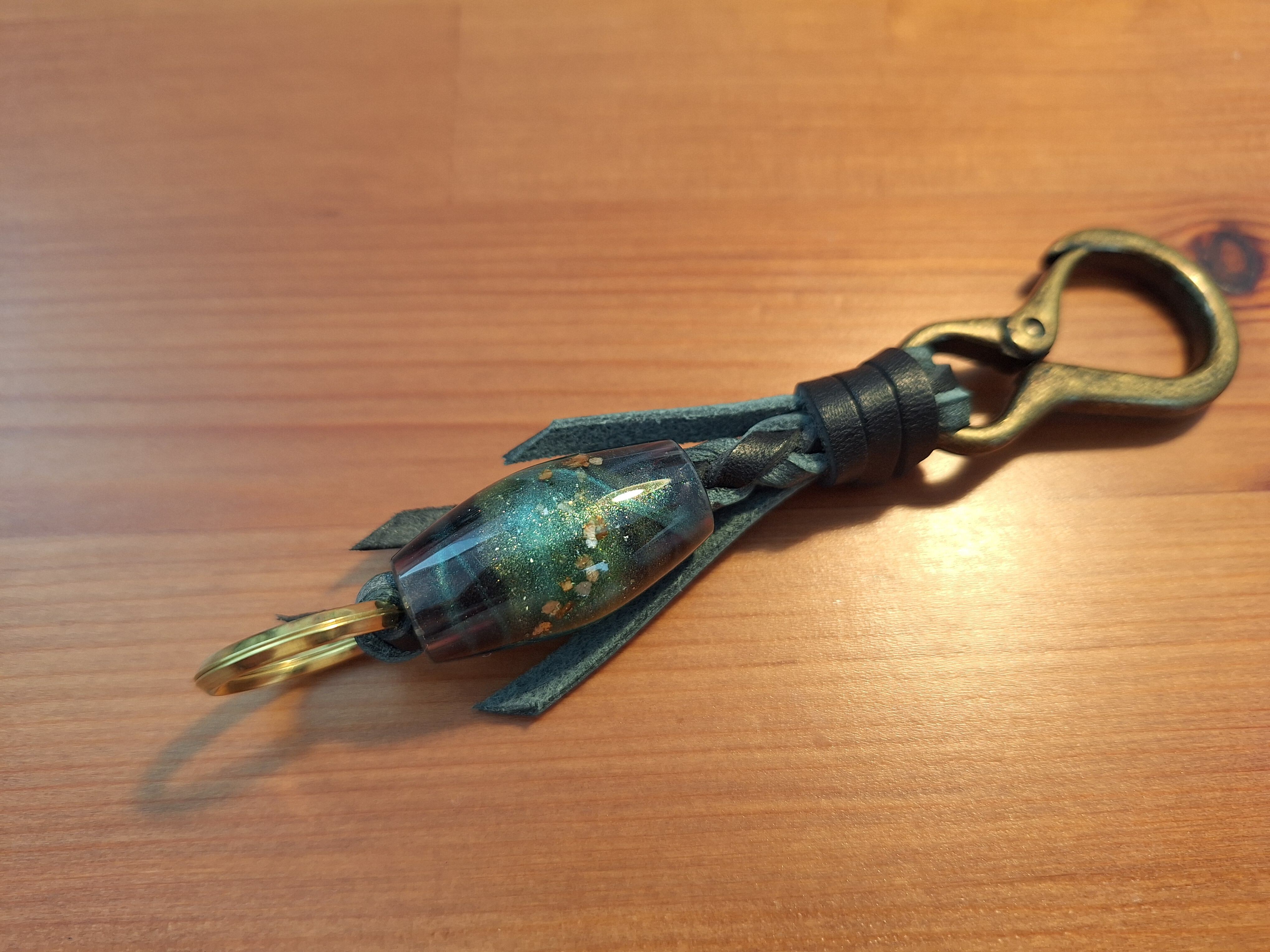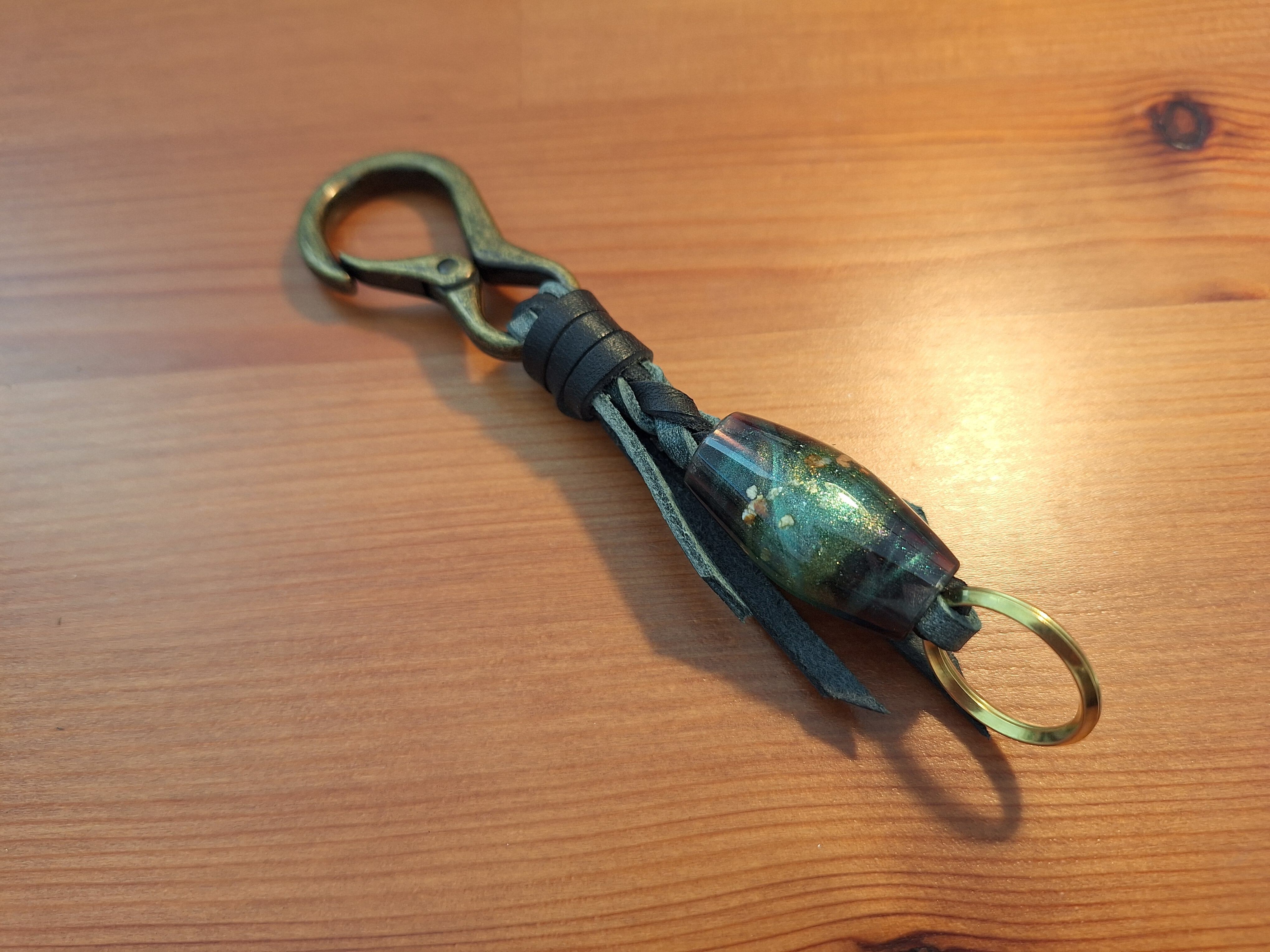 全長約12.5cm レザー紐(黒×グリーン) レジン製蜻蛉玉 カラビナ(アンティークゴールド)